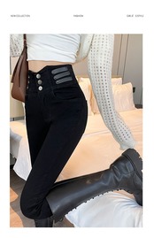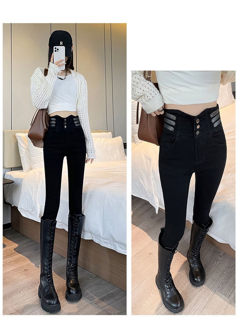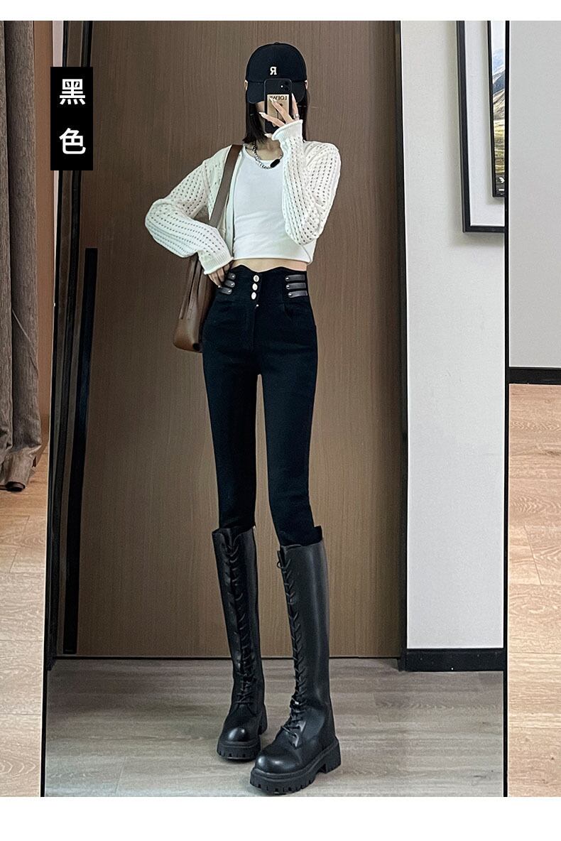 【ブラック】裏起毛 スキニーデニム レディース 超ハイウエスト ストレッチ 小脚パンツ 冬あったか 細見えデニムパンツ(ヴィンテージブルー/ブラック)