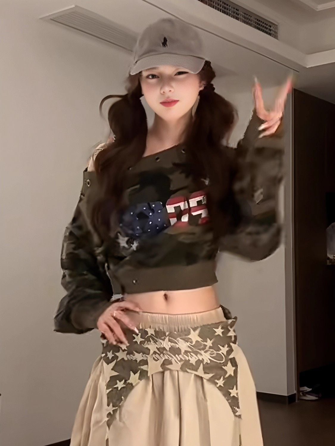 オフショル風ショート丈カモフラ柄スウェット|肩見せ×長袖で盛れるタイトトップス