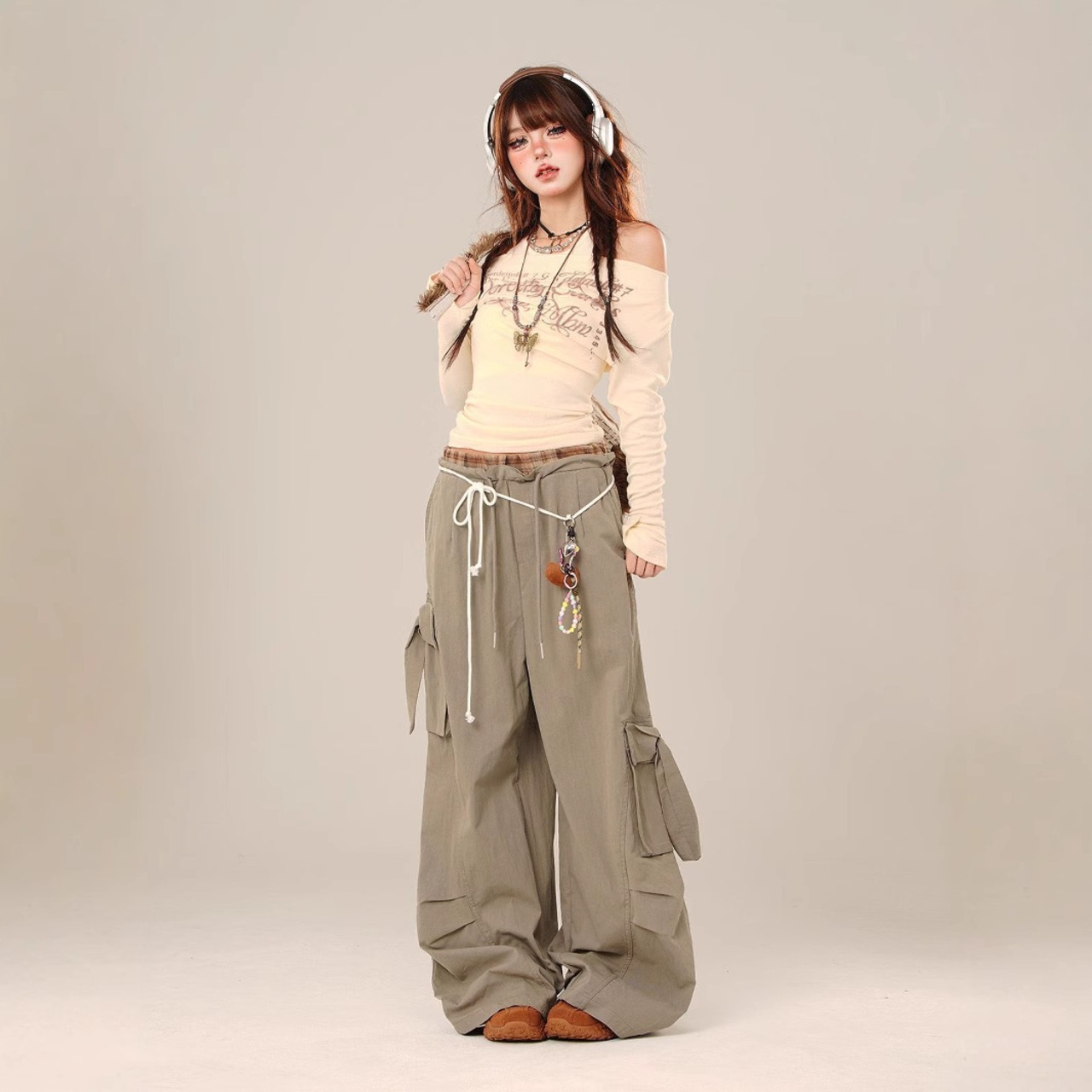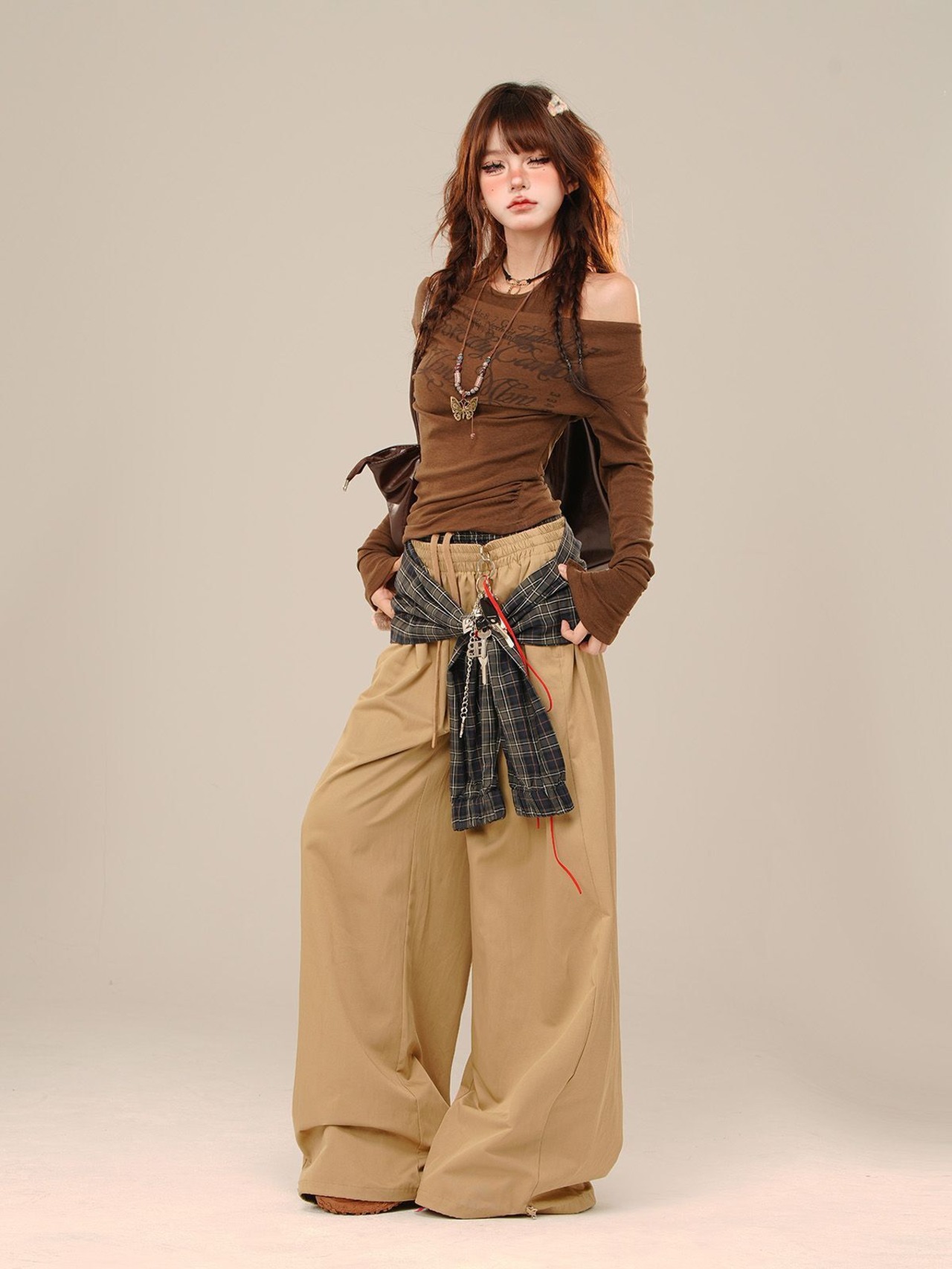 【ブラウン】オフショル風レイヤード長袖トップス|細見え・ウエストマーク・デザインカットソー/韓国っぽ 上品可愛い(コーヒー・アイボリー・グレー)
