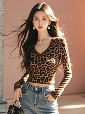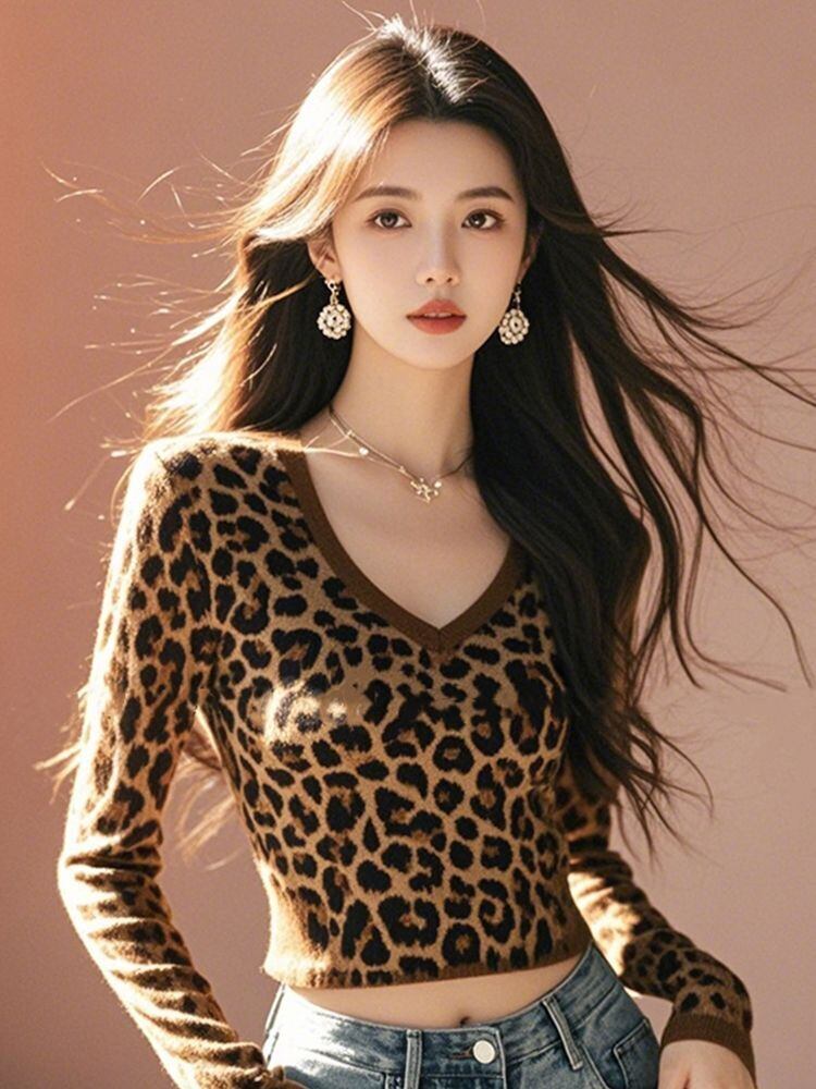 【冬新作】レオパード柄クロップドVネックトップス|美式ガーリー・デザインT・長袖・デロン風あったか素材・細見えインナー・S〜3XL