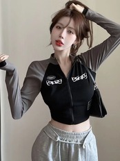 【黒×白肩】韓国風セクシーショートカーディガン レディース 長袖 POLO襟 ジップアップ 黒×白/黒×グレー