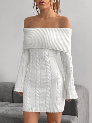 【レッド】高品質 オフショルダー ニットワンピース 長袖|タイトシルエットで色っぽ細見え✨デートコーデに