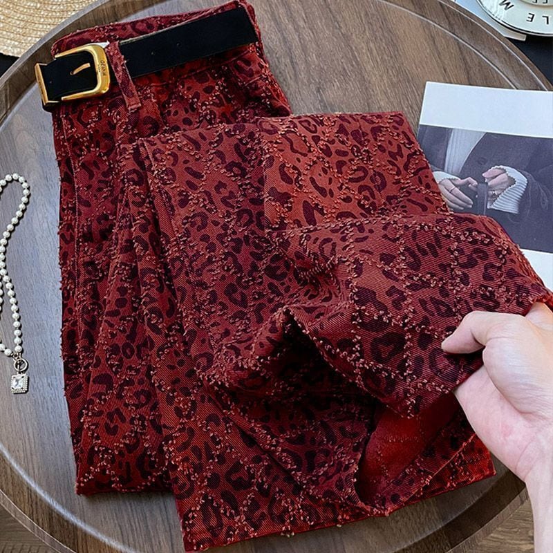 【レッドデニム】裏起毛デニム レオパード ストレート ワイドパンツ|高腰脚長 体型カバー 冬コーデ