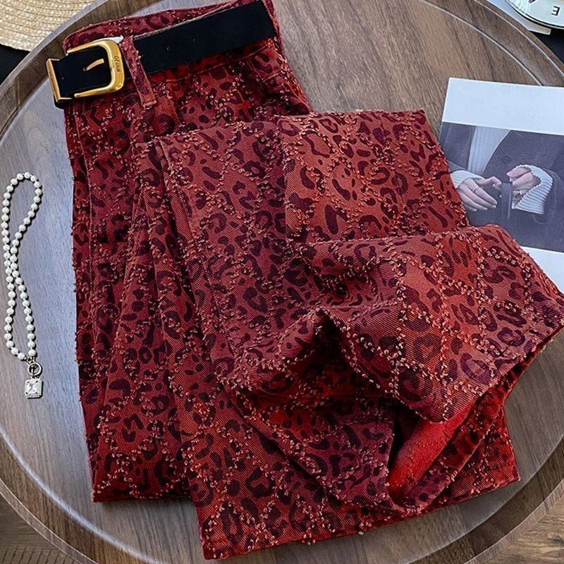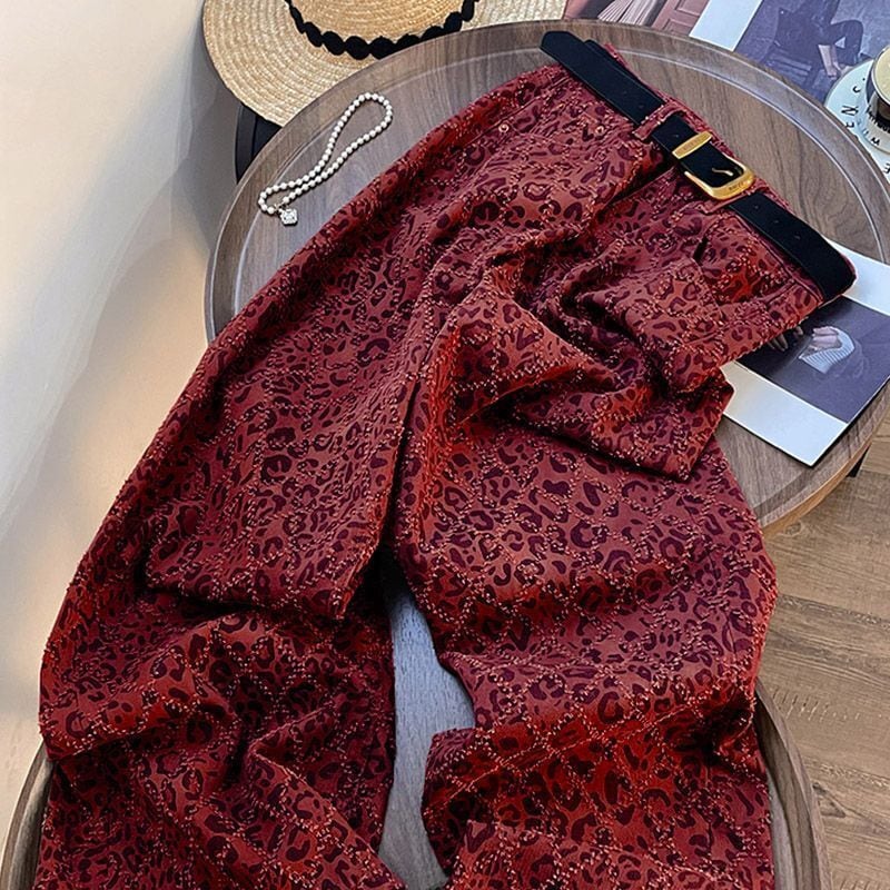 【濃紺デニム】裏起毛デニム レオパード ストレート ワイドパンツ|高腰脚長 体型カバー 冬コーデ