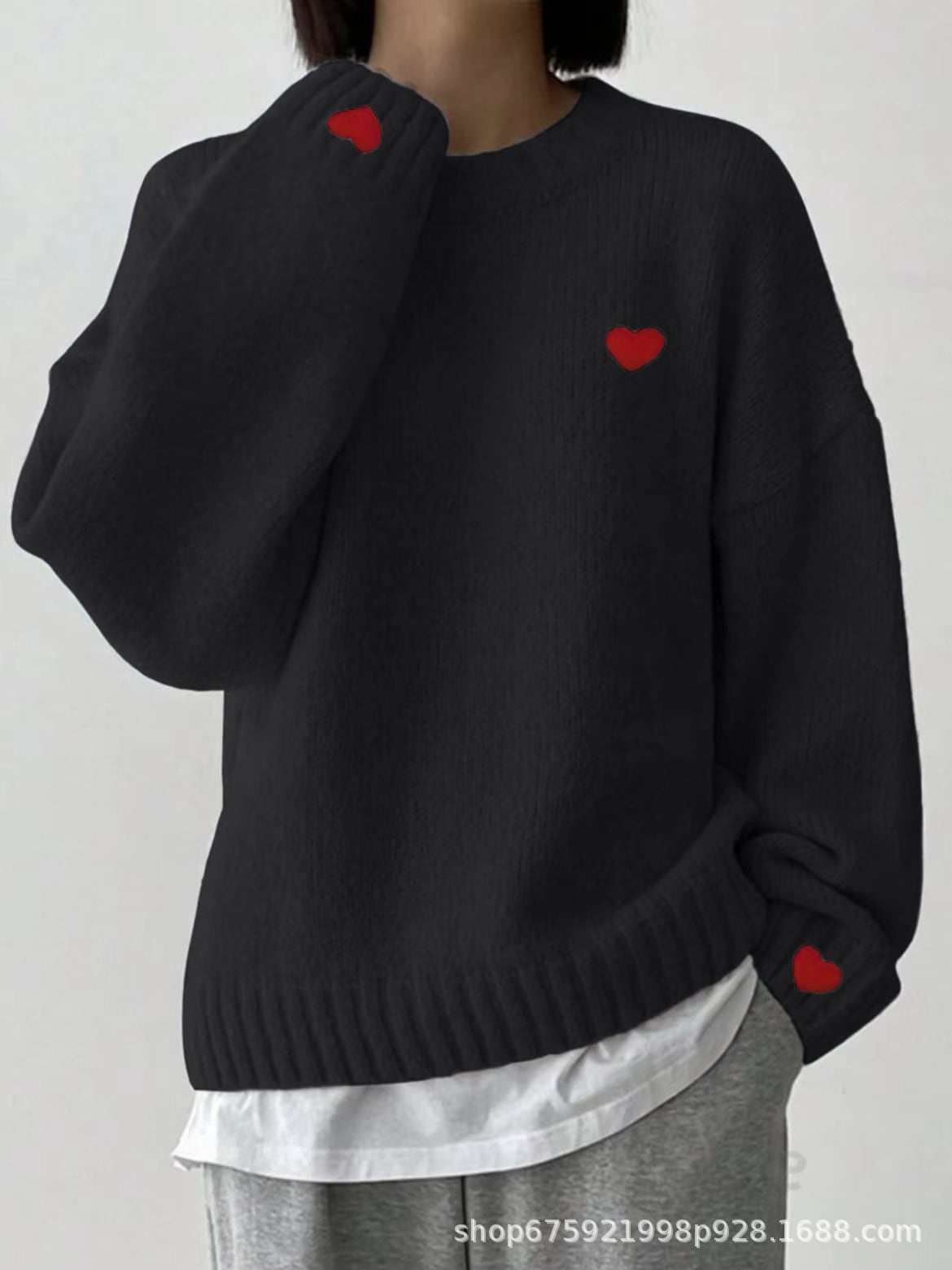 胸元の愛らしいハート刺繍がアクセントのゆるだぼニットセーター。
