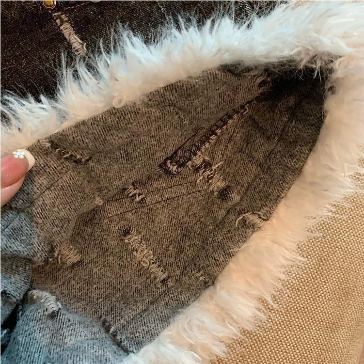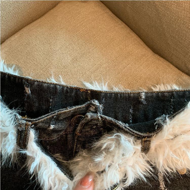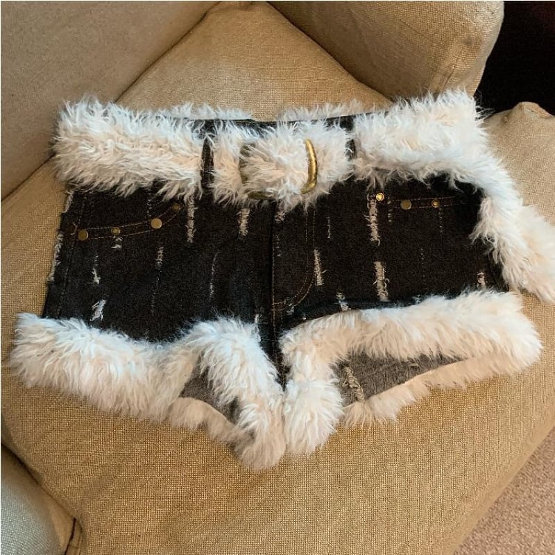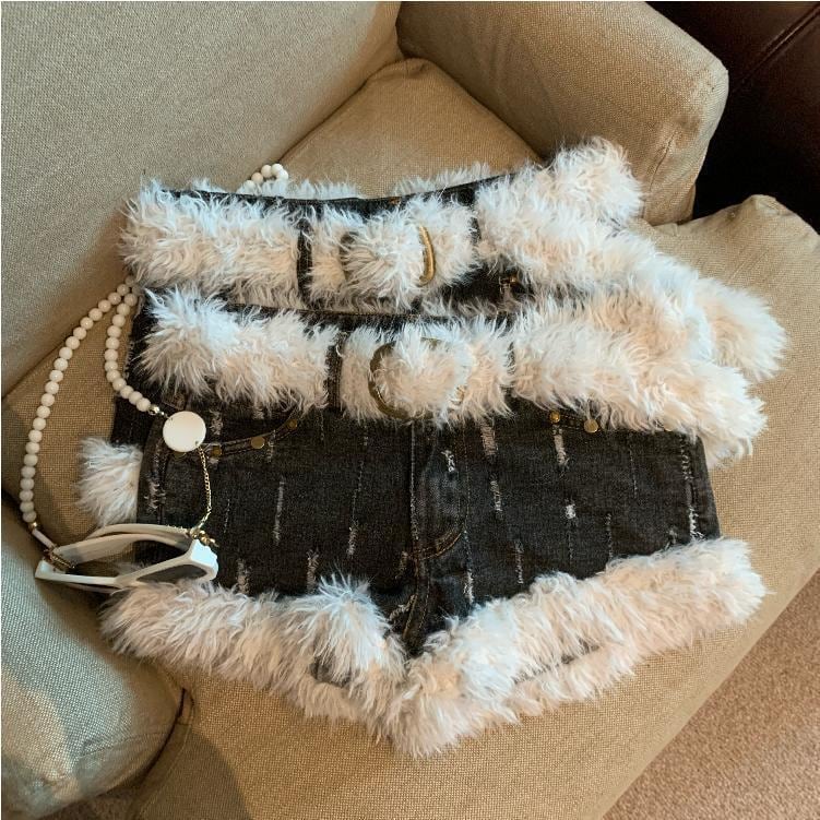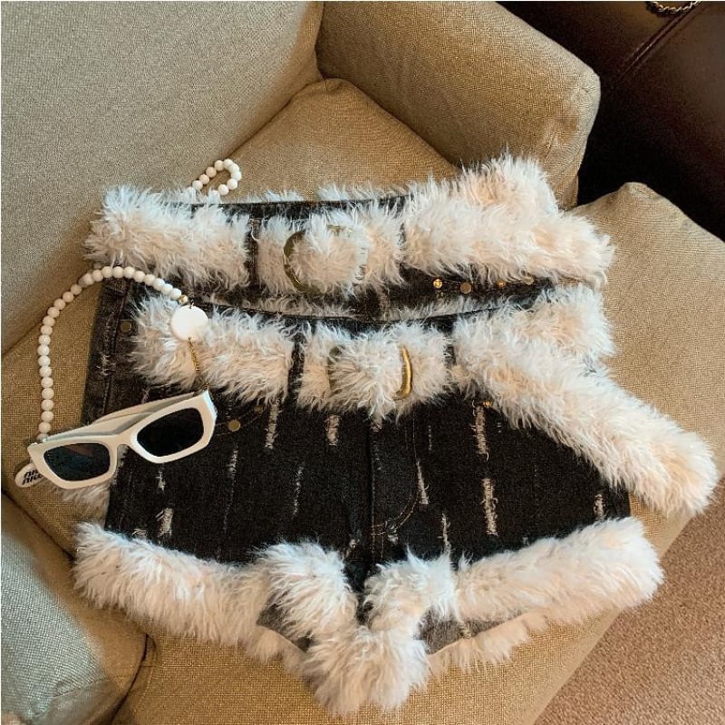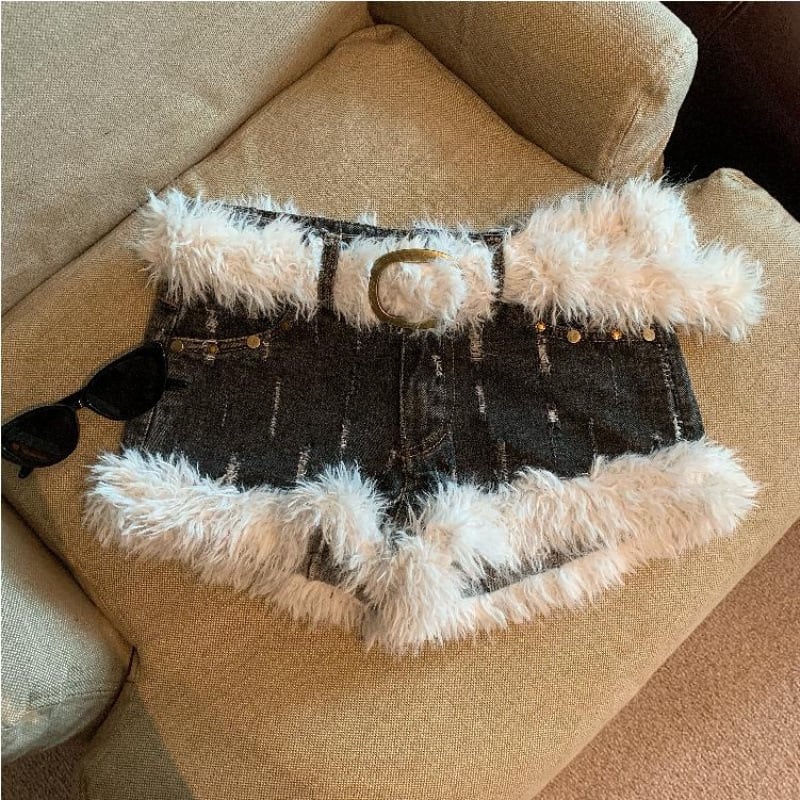 【グレー】フェイクファー ヴィンテージストリート ハイウエストデニムショート 脚長効果