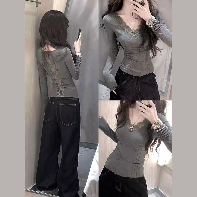 バックレース×Vネック 長袖タイトTシャツ|グレー 透け感チュールで魅せる冬のヘルシー色気トップス