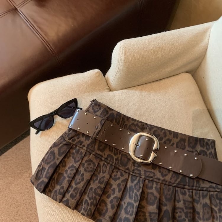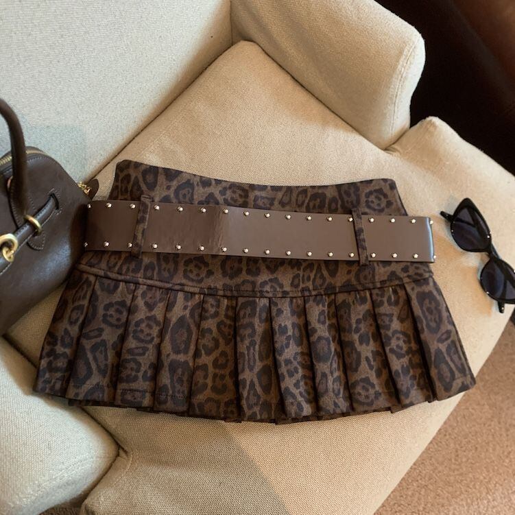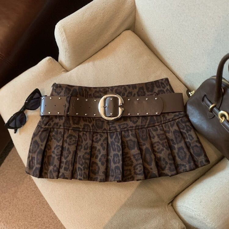 アメリカンレオパード柄 ハイウエスト プリーツミニスカート 防透け仕様 美脚見え Y2K ストリート 秋冬対応