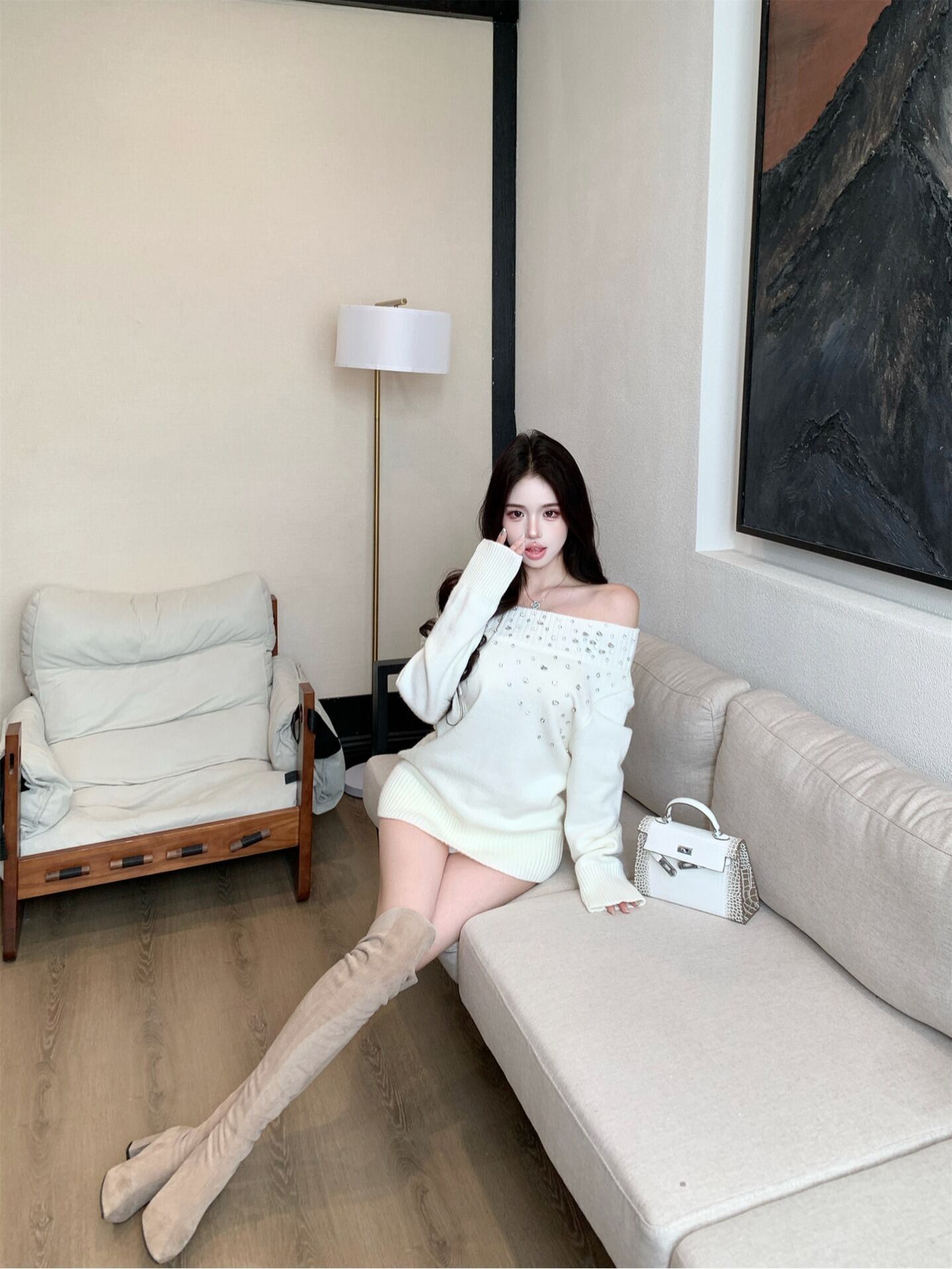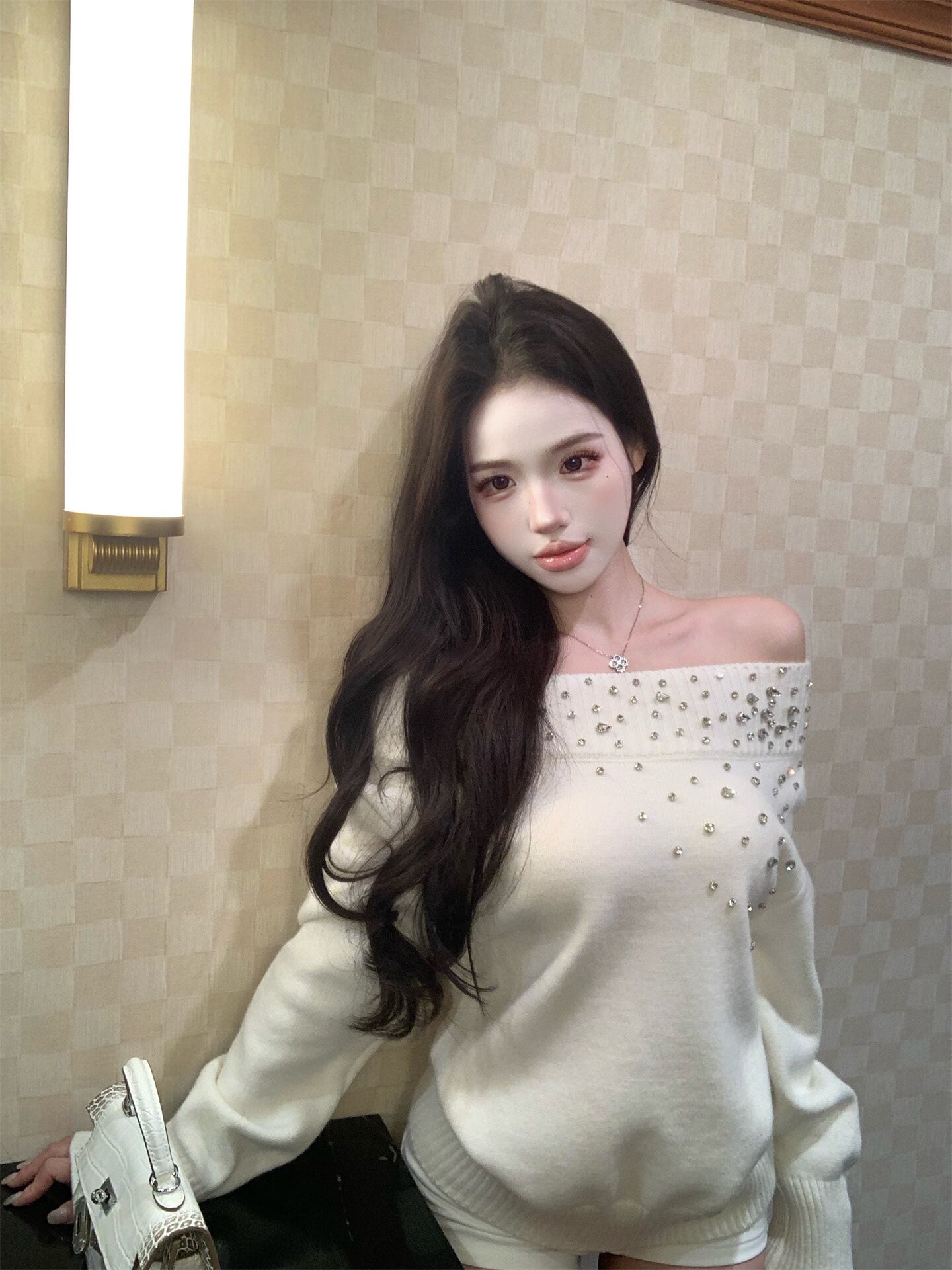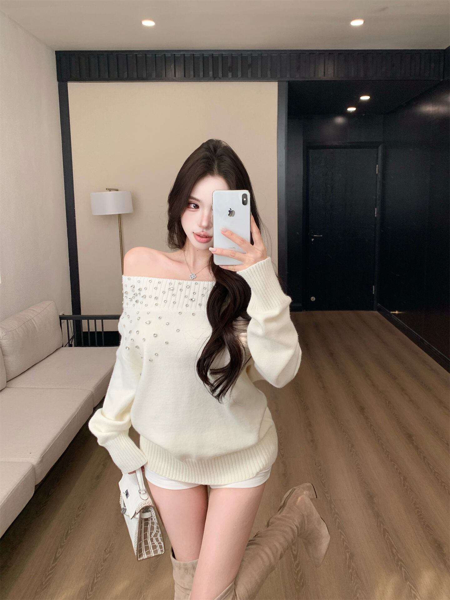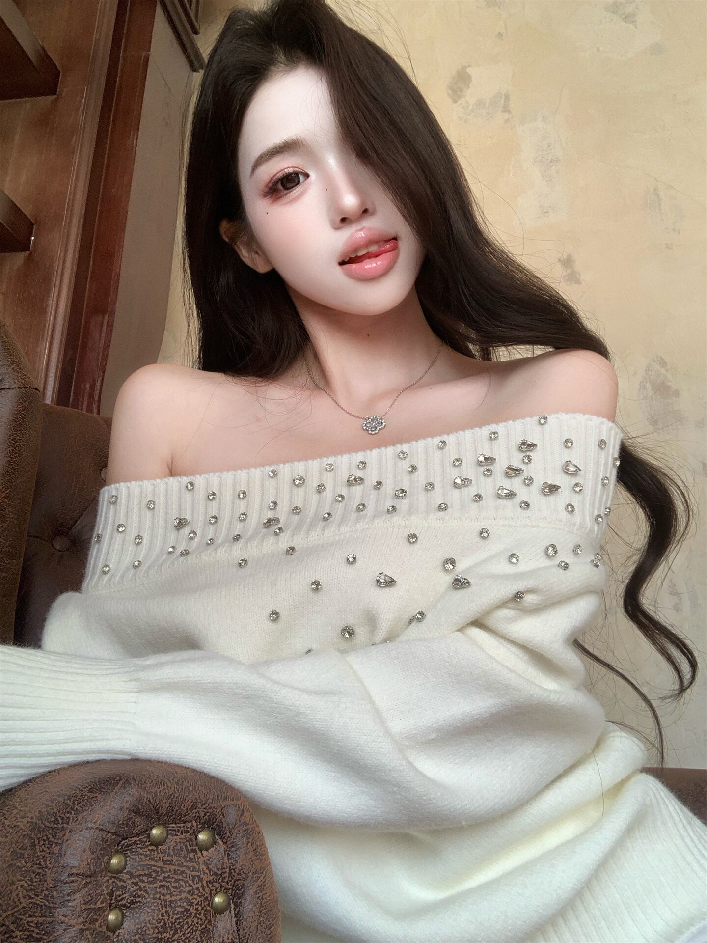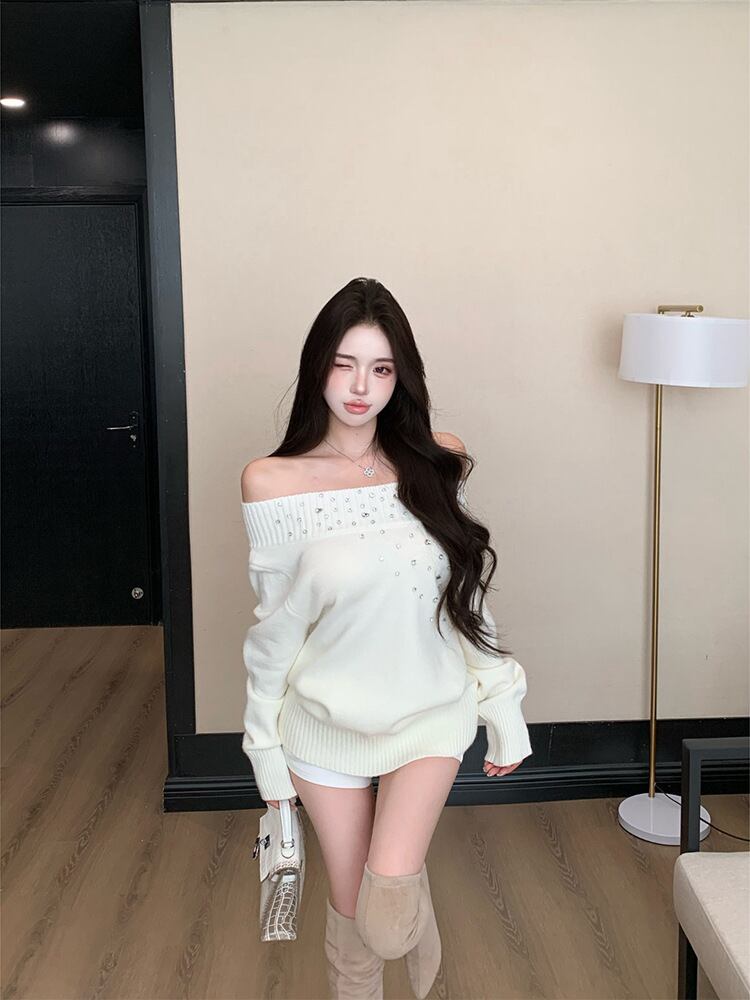 ワンショル ビジュー付き オフショル風ニットトップス|秋冬2025 デザインニット ゆったり 長袖 セーター