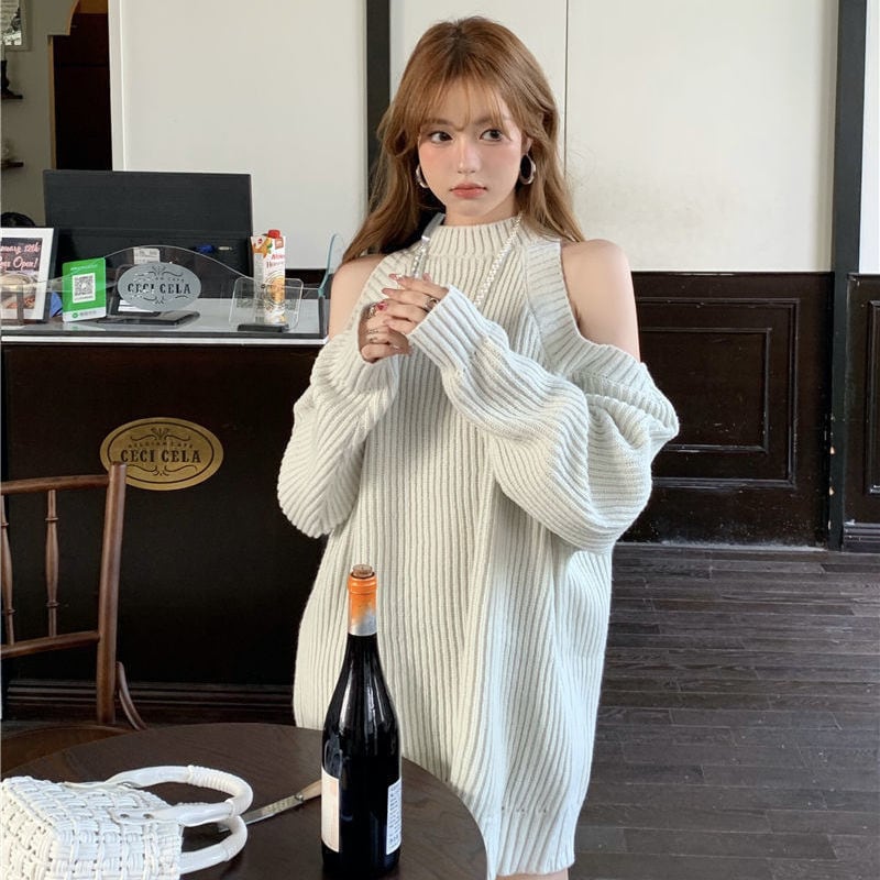 肩見せ ニットトップス レディース|韓国風 通勤 ?欲系 ゆるニット 破れデザイン 中丈 秋冬2025
