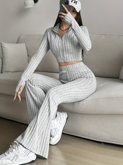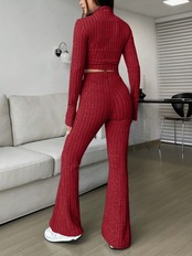 リブ素材のジップアップトップスと、ハイウエストのフレアパンツを組み合わせた2点セットです。