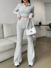 【ライトグレー】リブ素材 ジップアップトップス& ハイウエスト フレアパンツ セットアップ (レディース)