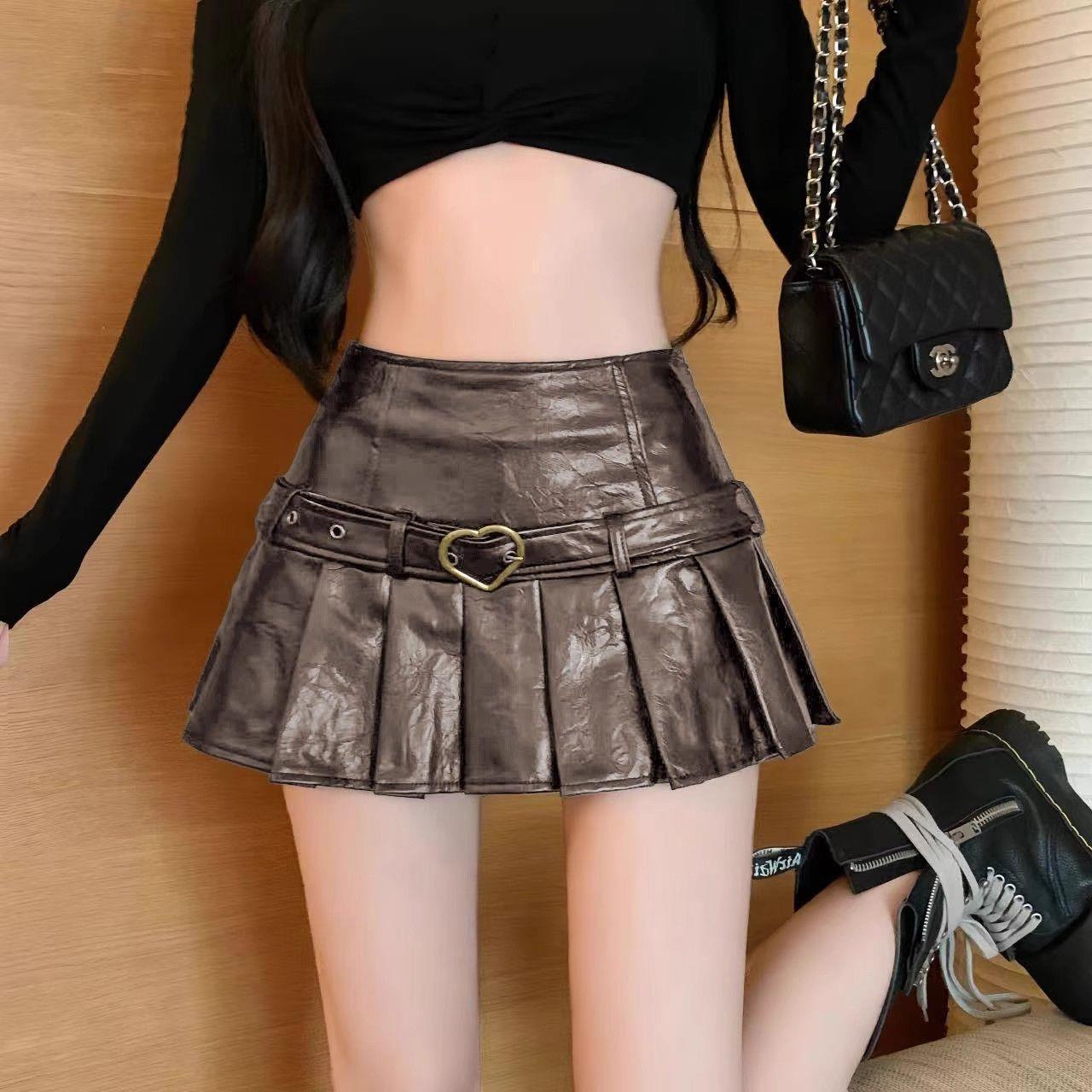 【ブラウン】レザーライク プリーツスカート ハイウエスト ミニ丈 ヴィンテージ風 秋 冬
