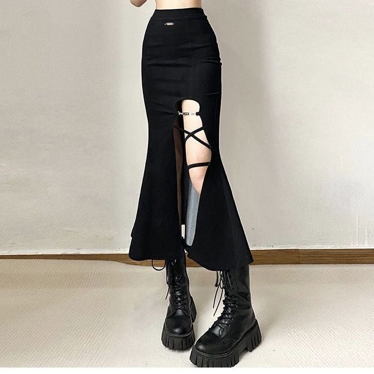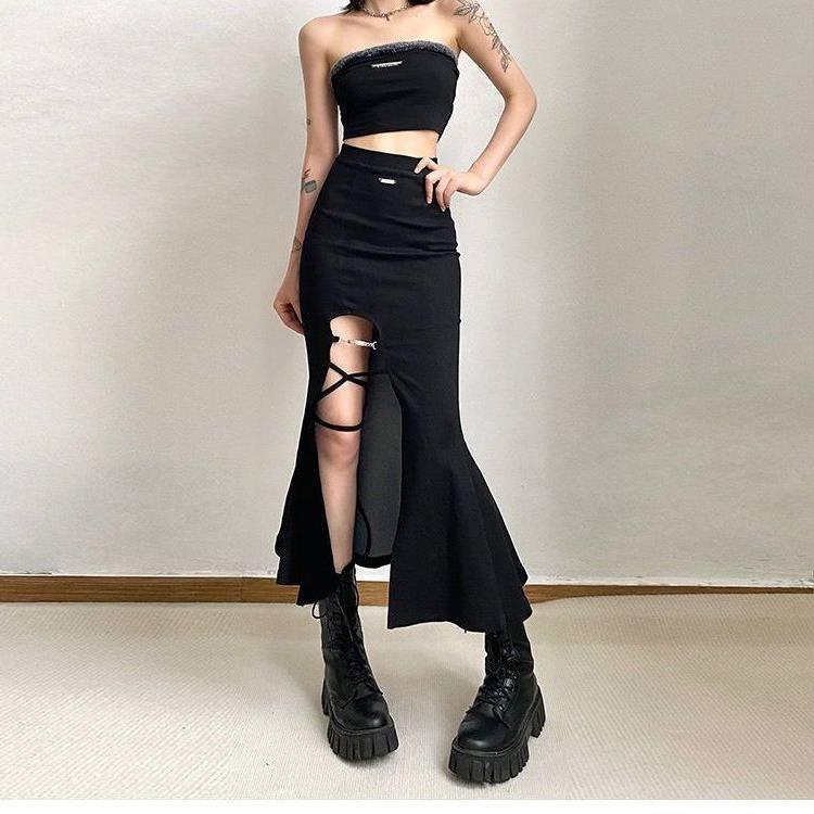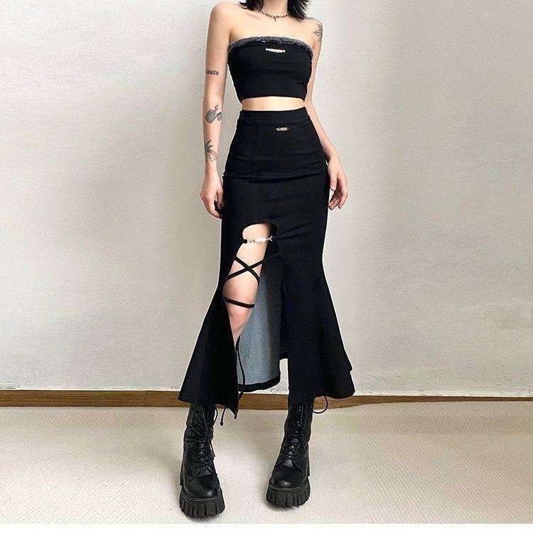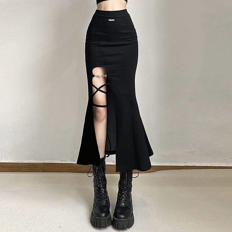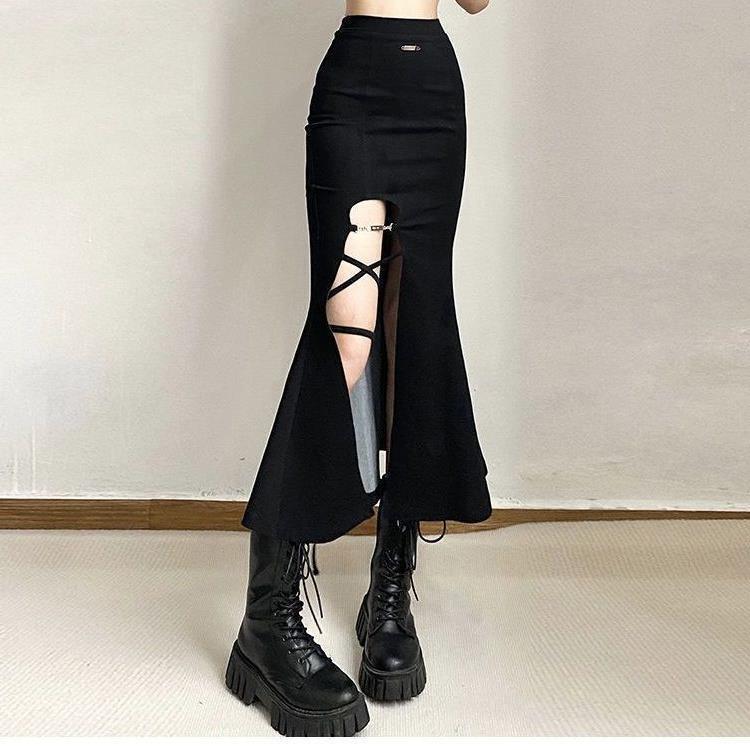 サイドレースアップ デザイン アシンメトリー マーメイドロングスカート クールギャル ストリート レディース