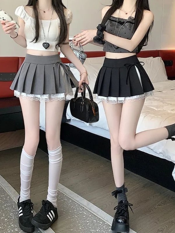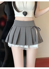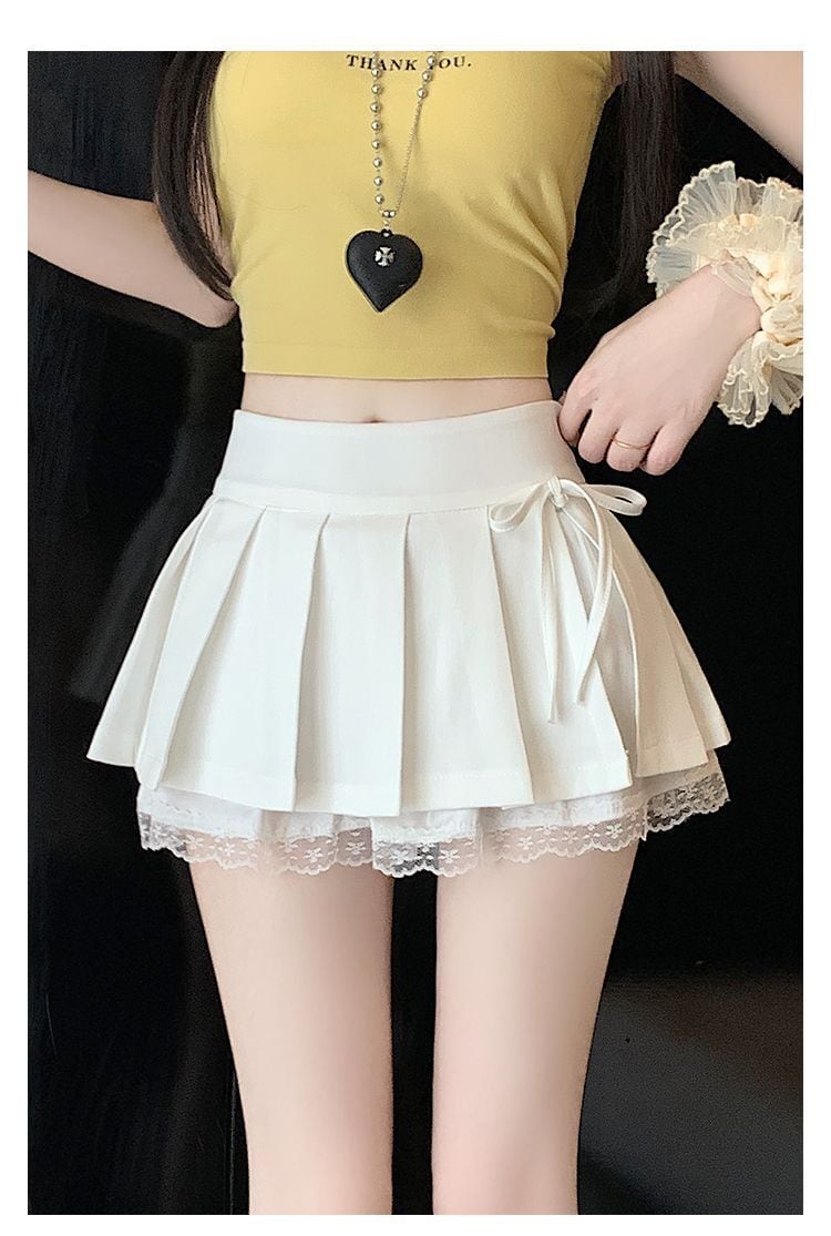 【ホワイト】レース切替 プリーツミニスカート リボンデザイン ハイウエスト 美脚見え 甘ギャル フェミニン レディース 春夏