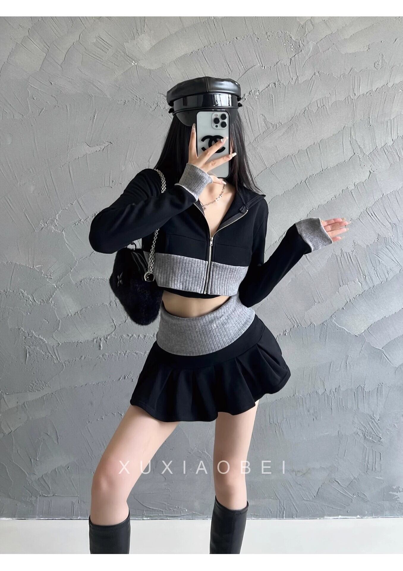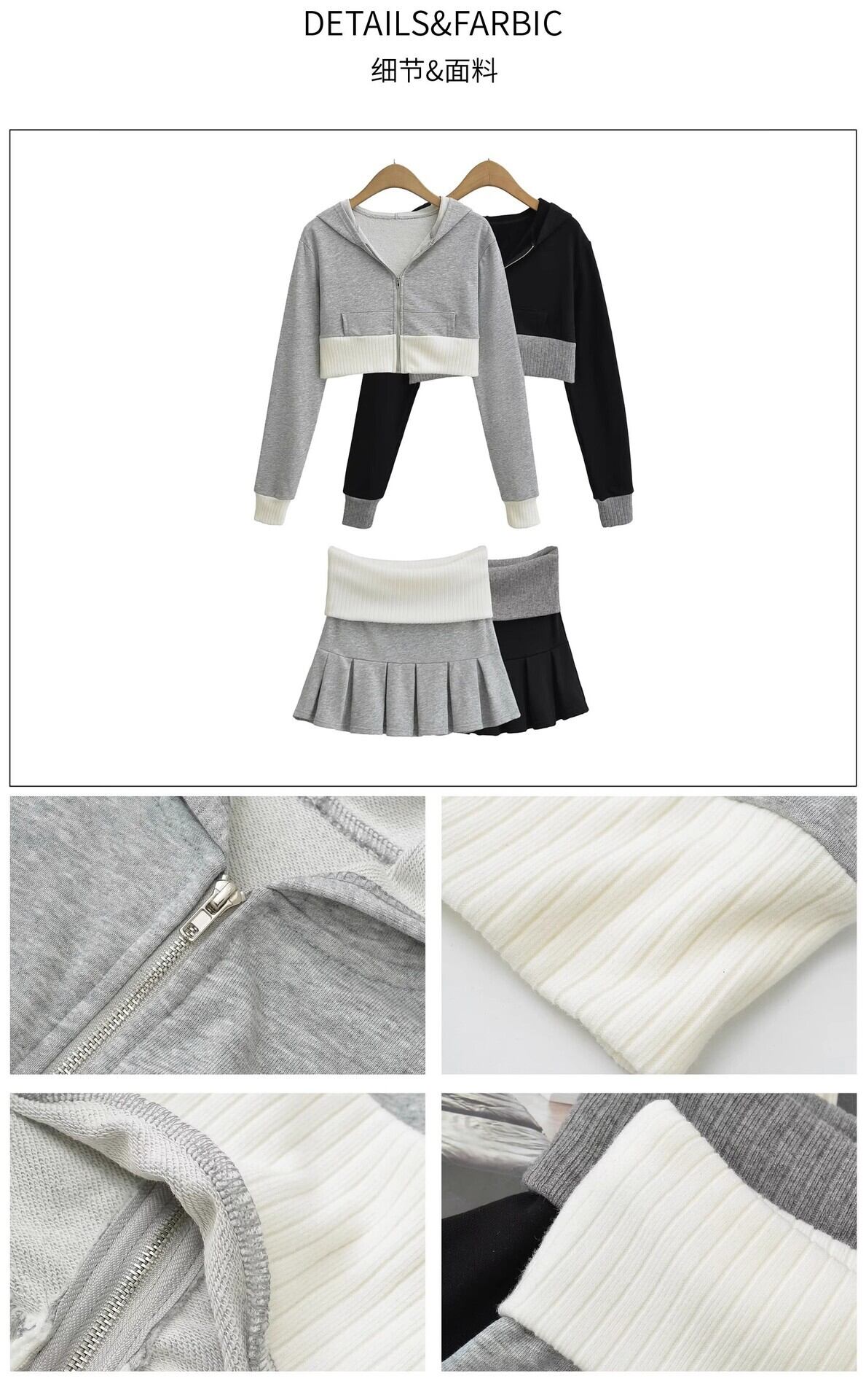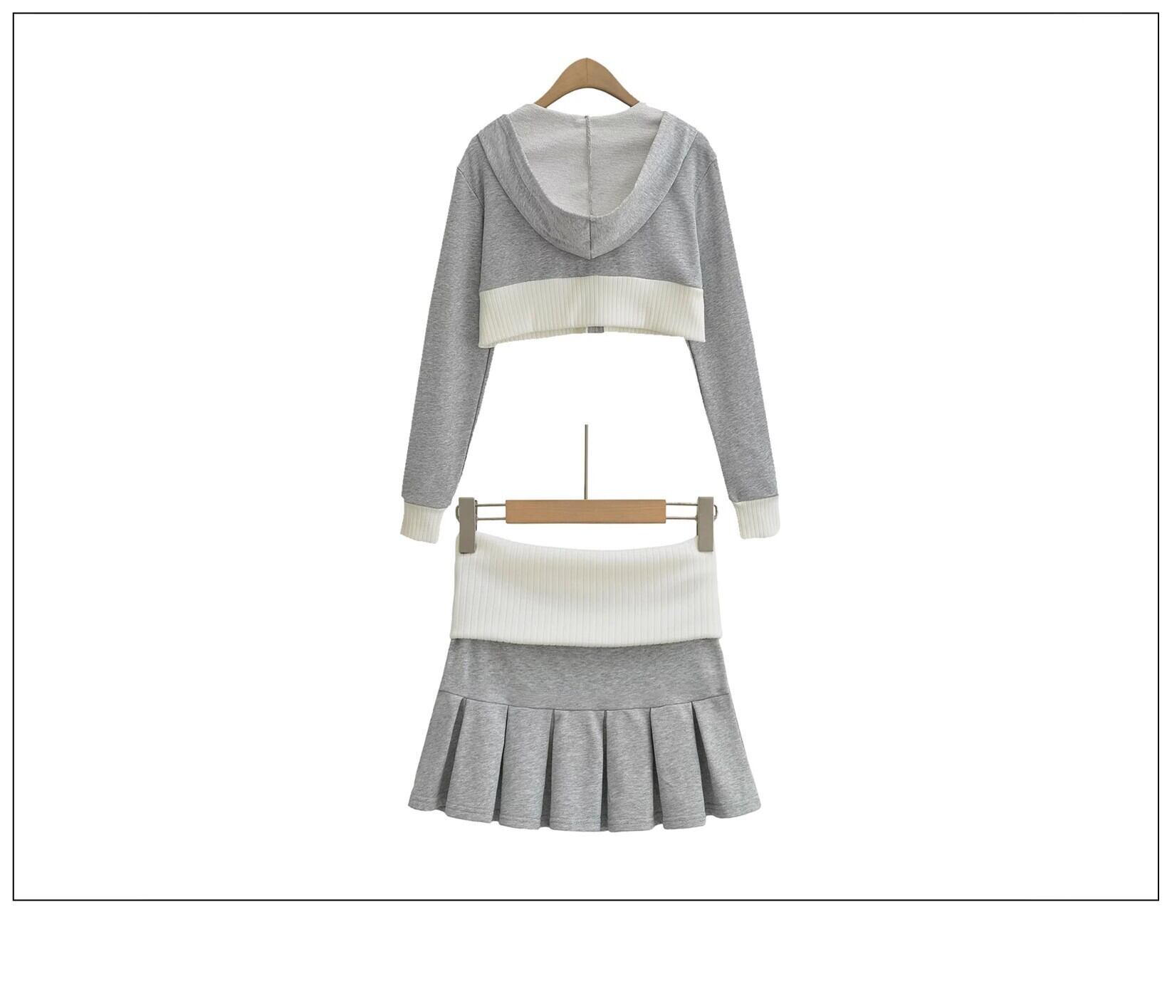 【グレー】アメリカンギャル風 ニットセットアップ ショート丈トップス × ミニスカート 配色デザイン シェニール素材 春コーデ レディース