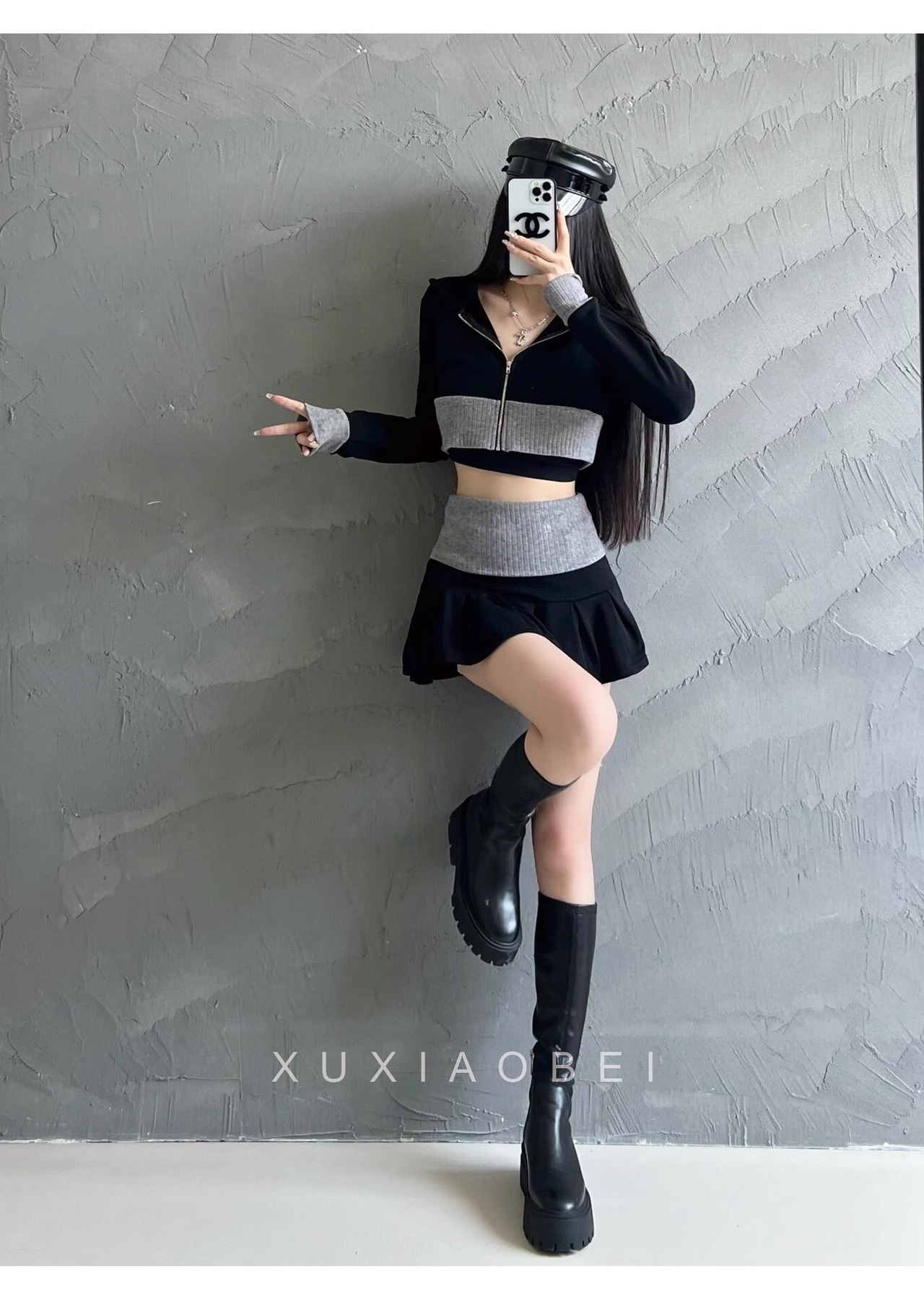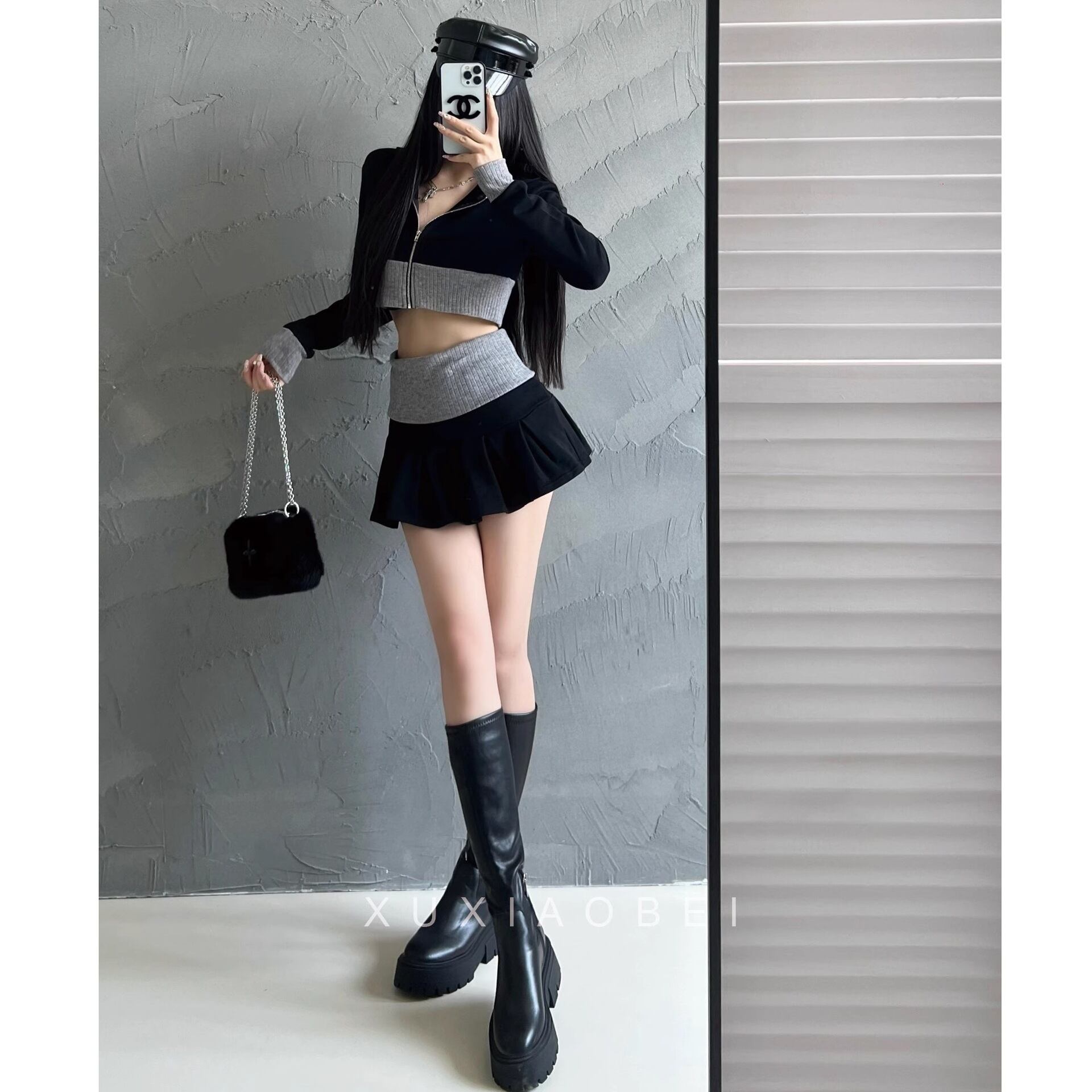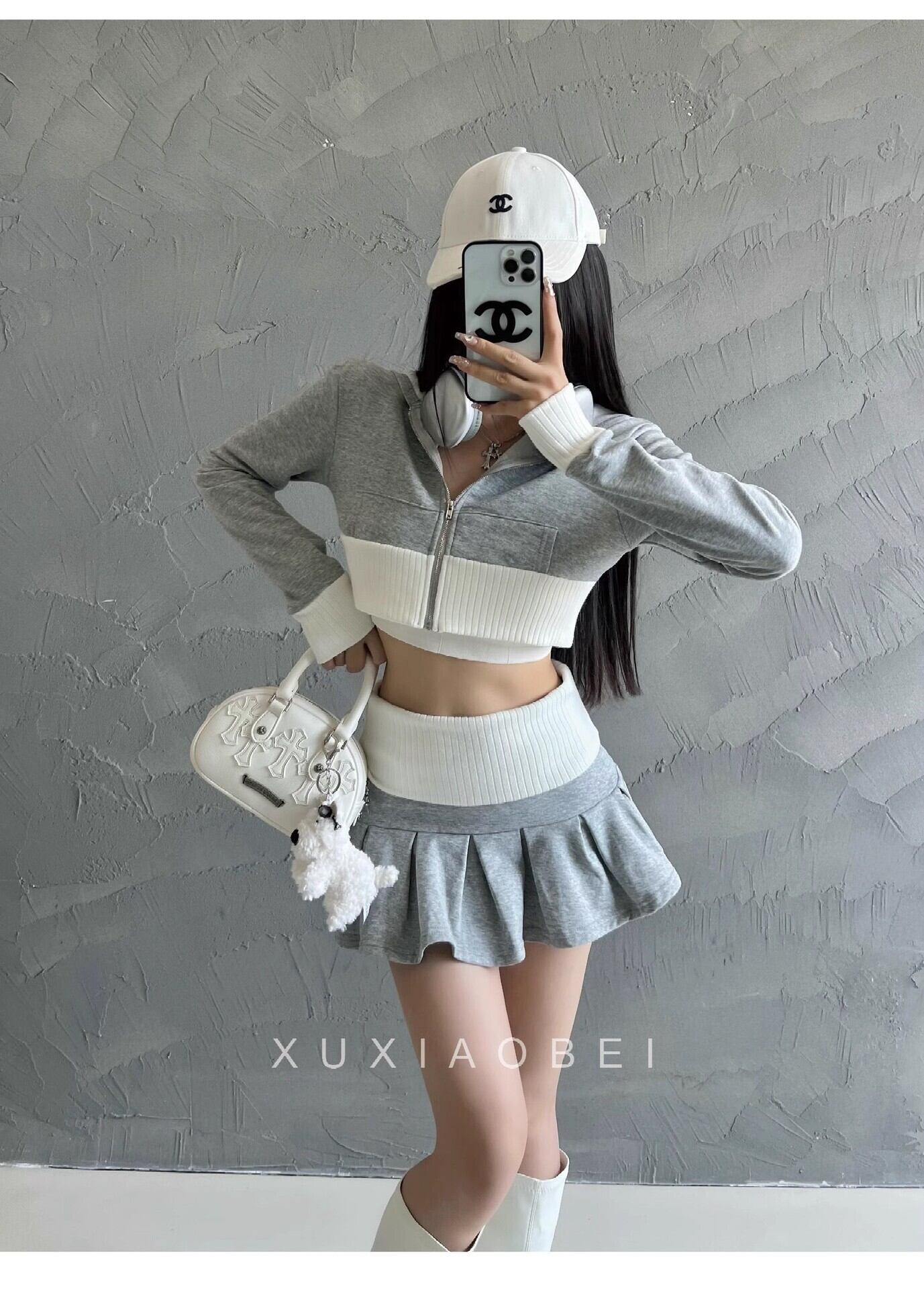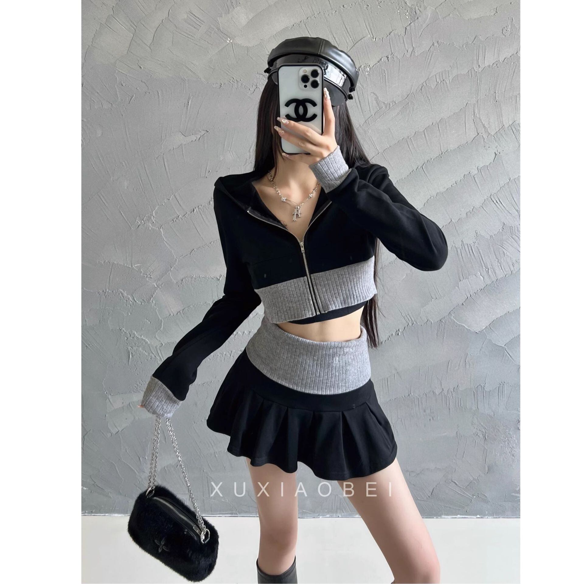 【グレー】アメリカンギャル風 ニットセットアップ ショート丈トップス × ミニスカート 配色デザイン シェニール素材 春コーデ レディース