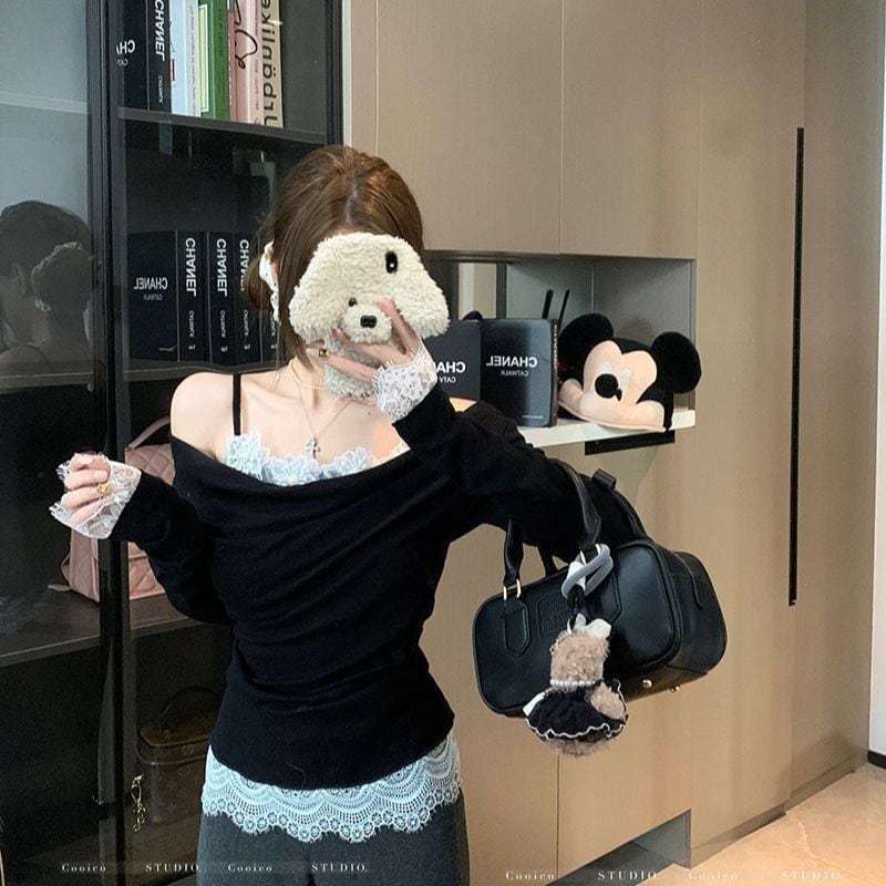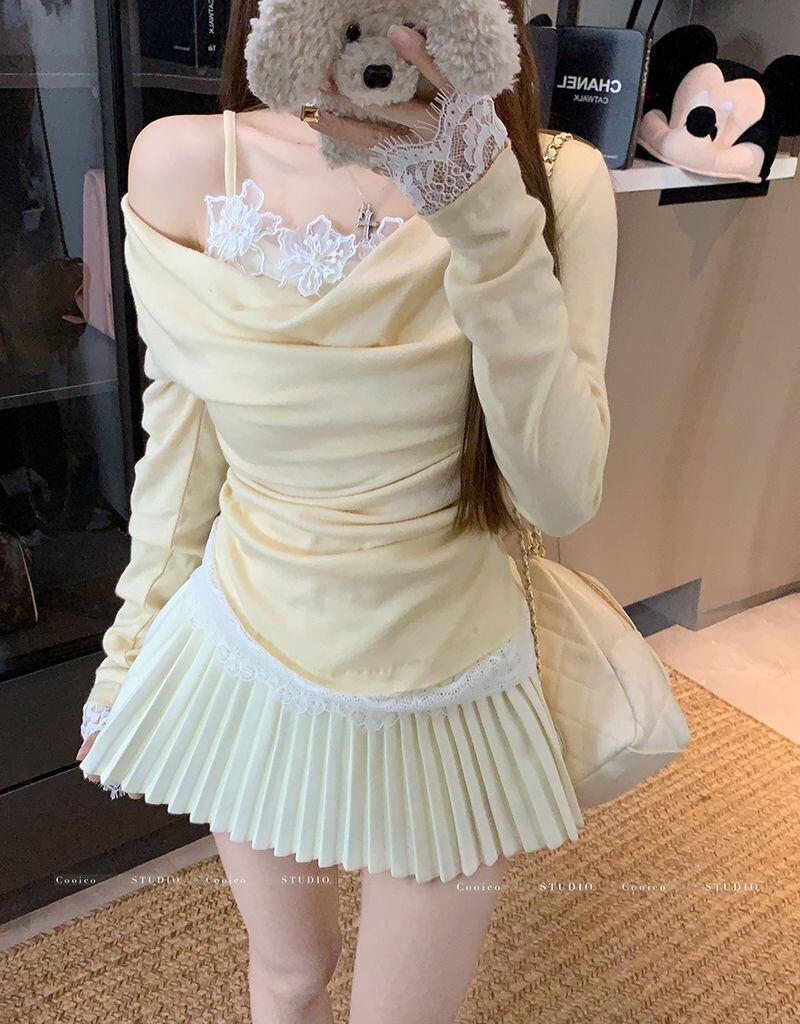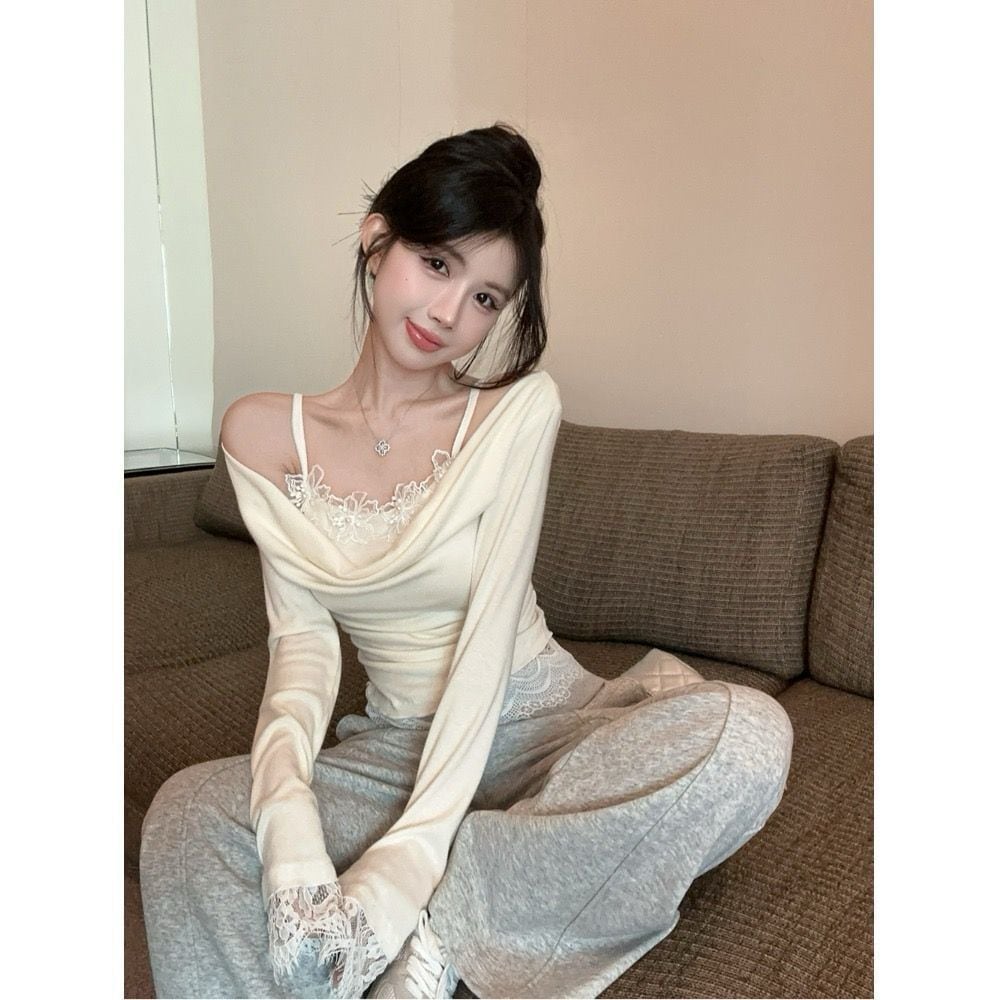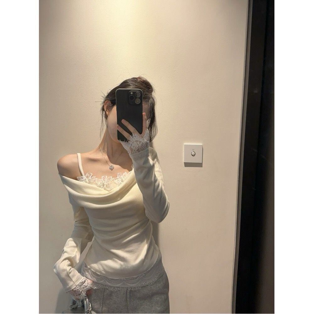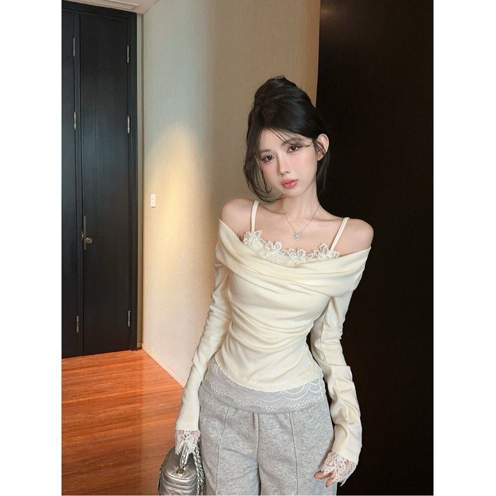 【アプリコット】レース切替 オフショル風 レイヤードTシャツ コットン素材 タイトフィット 長袖トップス 春秋 ギャルコーデ レディース