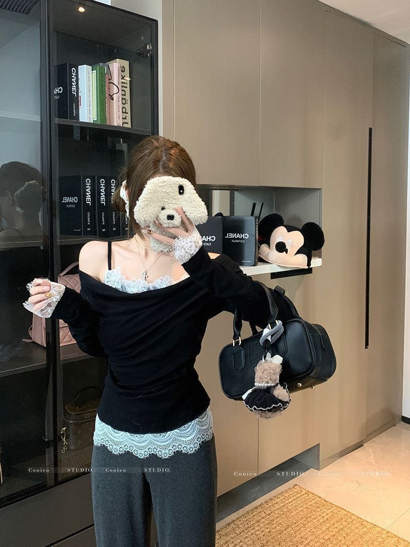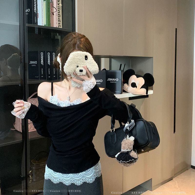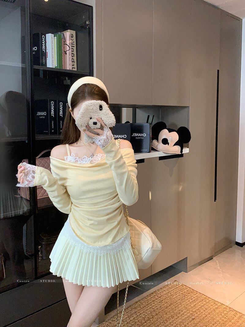 【イエロー】レース切替 オフショル風 レイヤードTシャツ コットン素材 タイトフィット 長袖トップス 春秋 ギャルコーデ レディース
