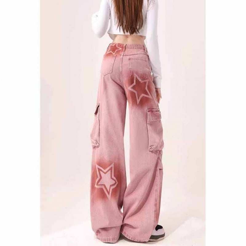 ピンク 星柄プリント ワイドデニムパンツ ハイウエスト ストレートシルエット ゆったりサイズ展開 ギャル ストリート レディース