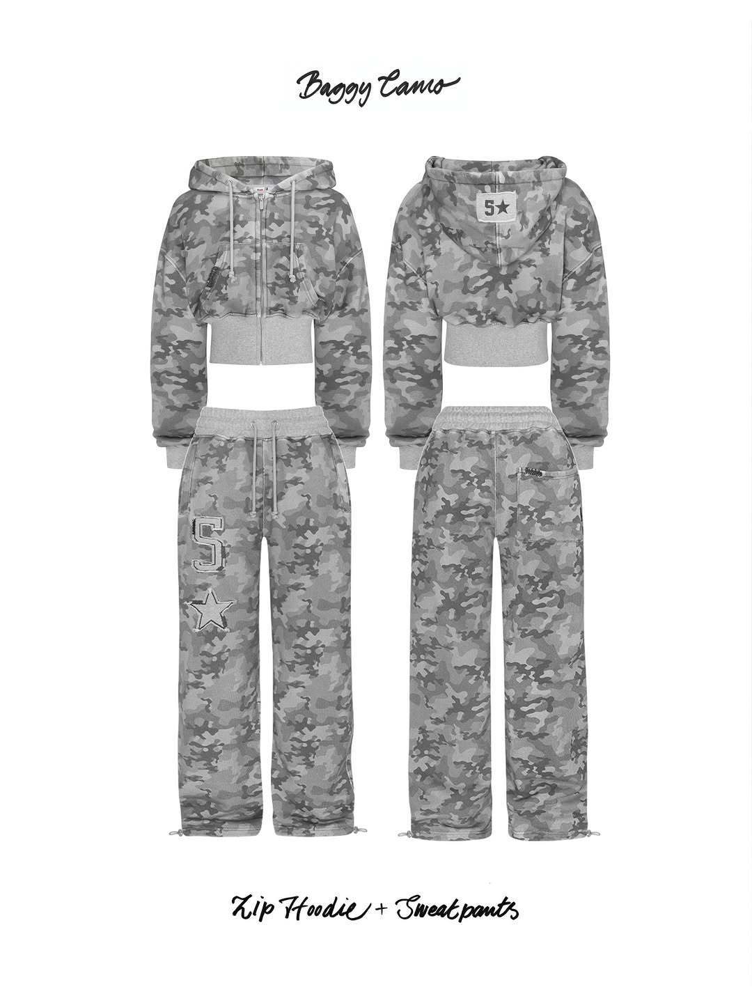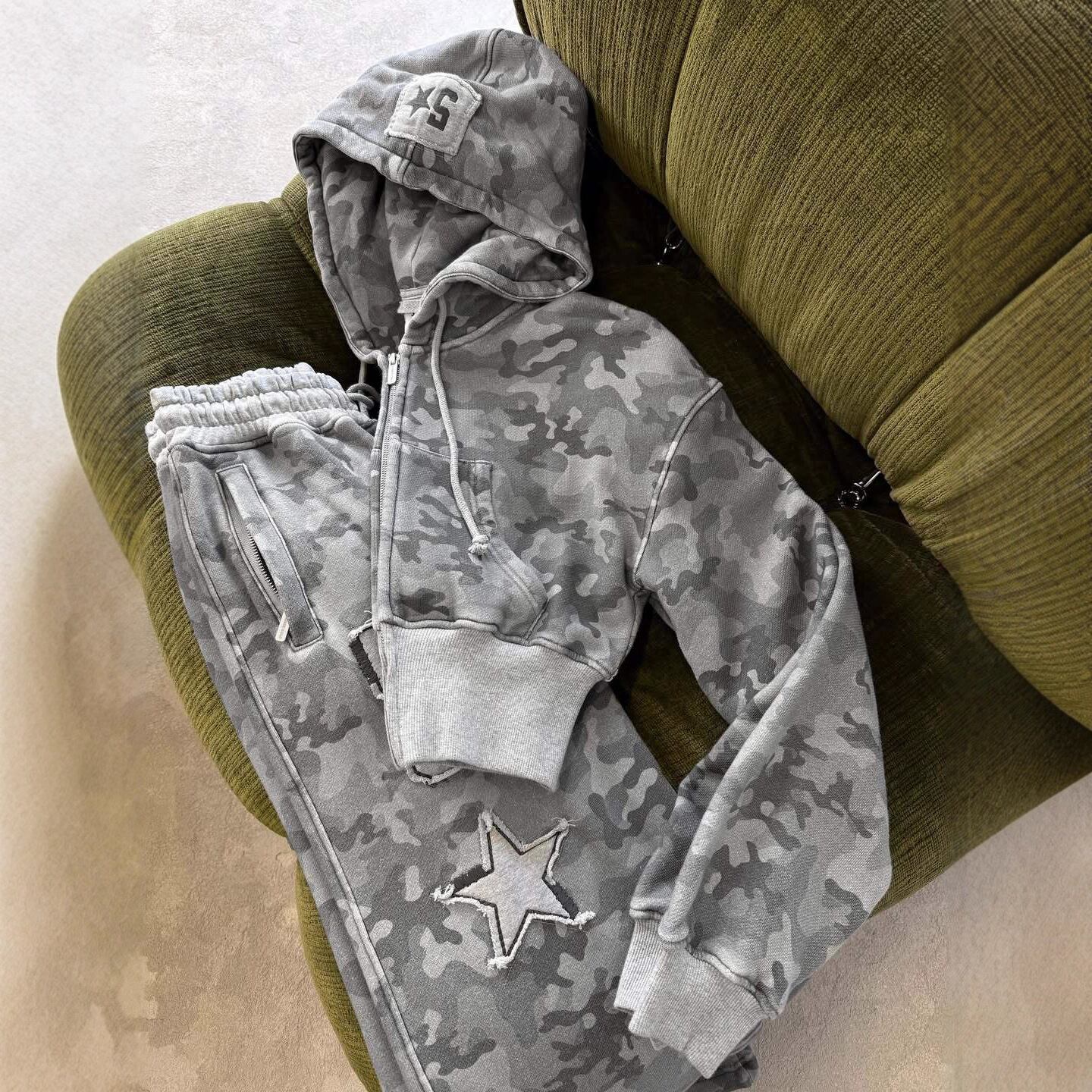 【グレー迷彩】Y2Kストリート ショート丈フーディ&ワイドパンツ セットアップ ジップアップ パーカー 春コーデ 美シルエット レディース
