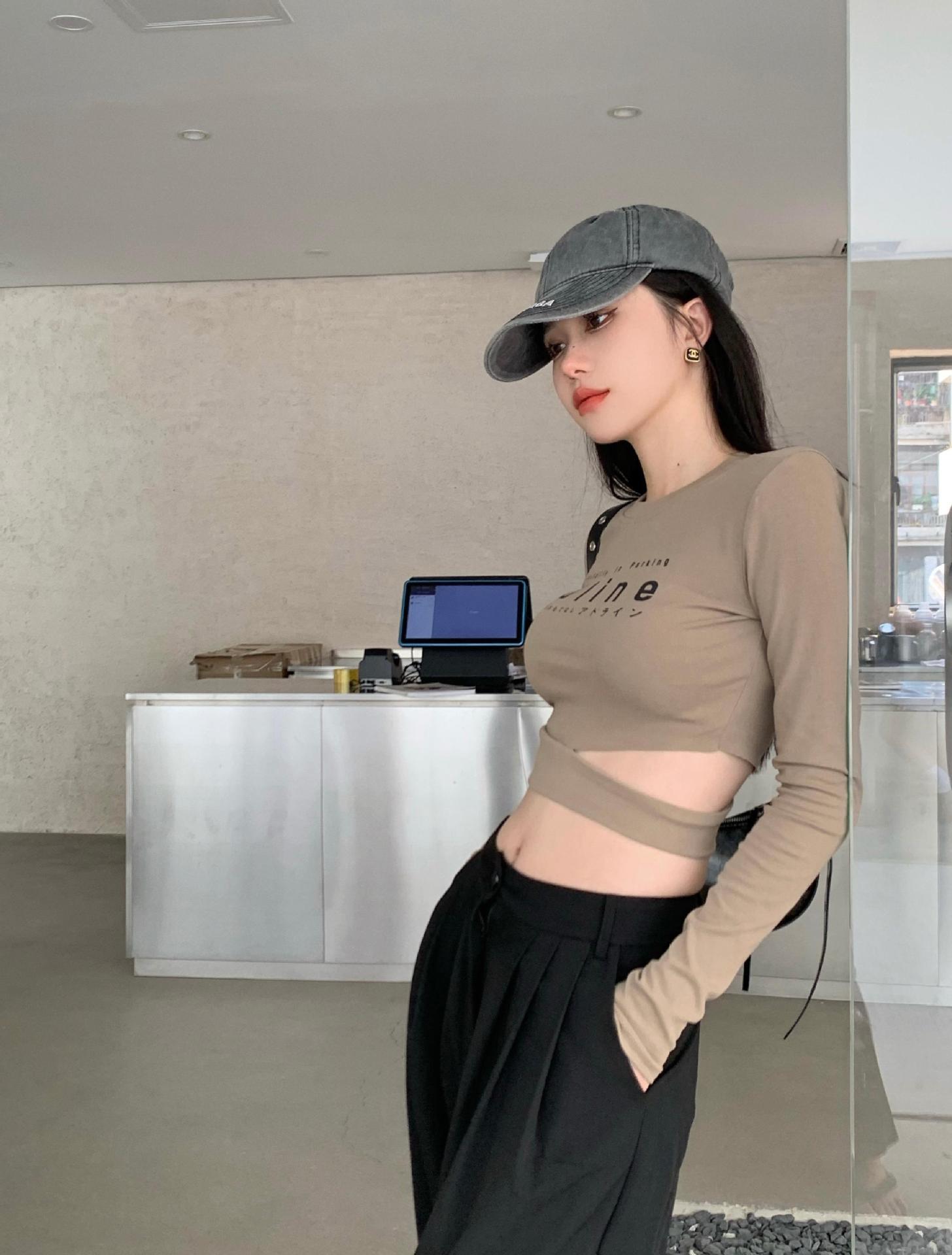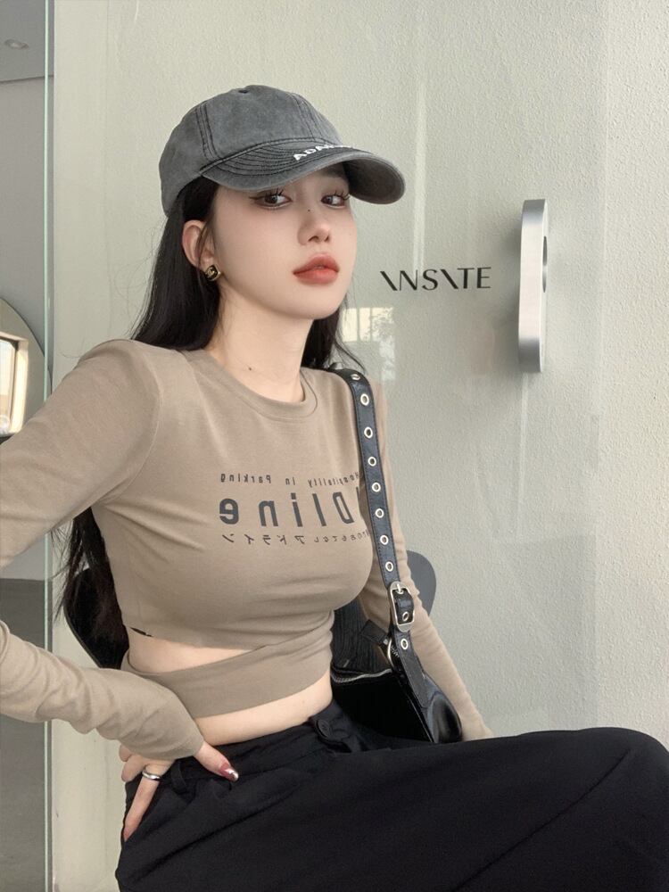 【カーキ】ダンス映え◎ ショート丈 長袖フィットTシャツ へそ出し コンパクトトップス 春コーデ レディース ギャル ストリート