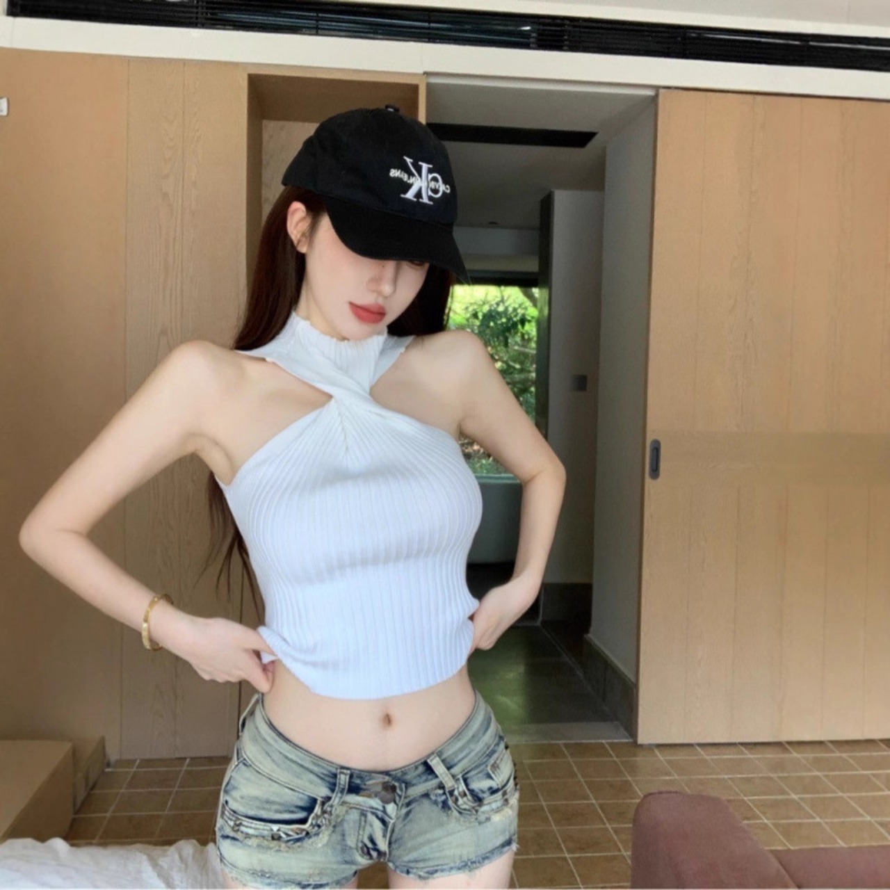 ローウエストデニムショートパンツ。