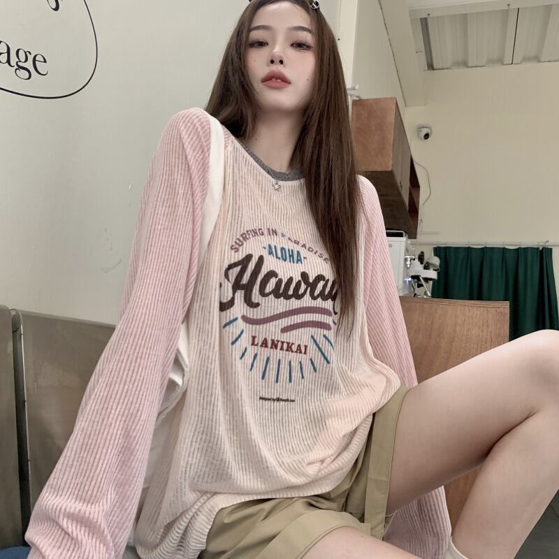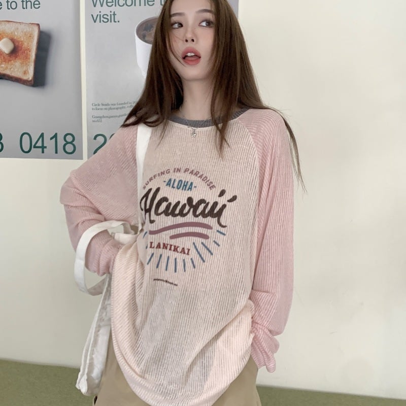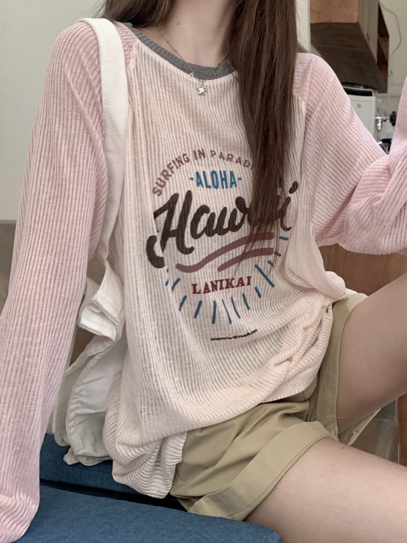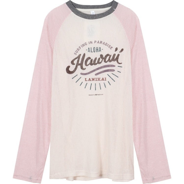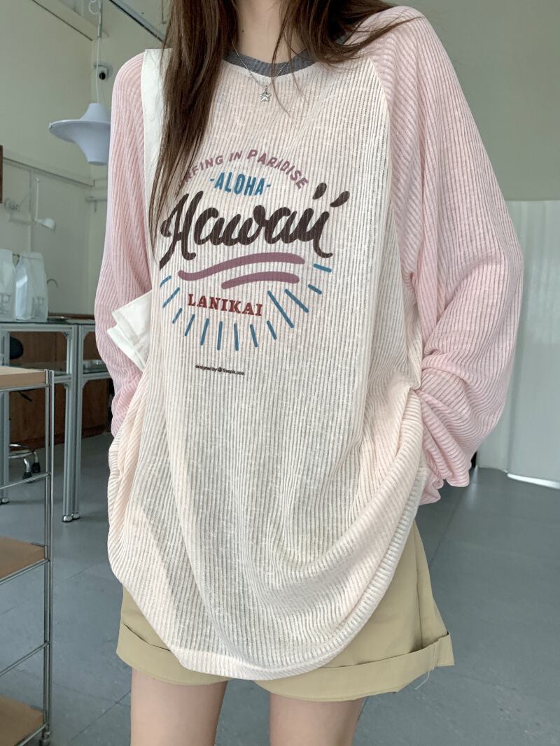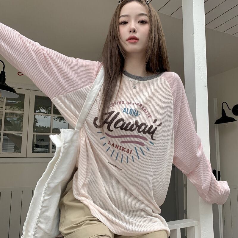 アメリカンロゴ プリント長袖Tシャツ|薄手 ルーズフィット|配色ラグラン袖|UV対策 春夏トップス