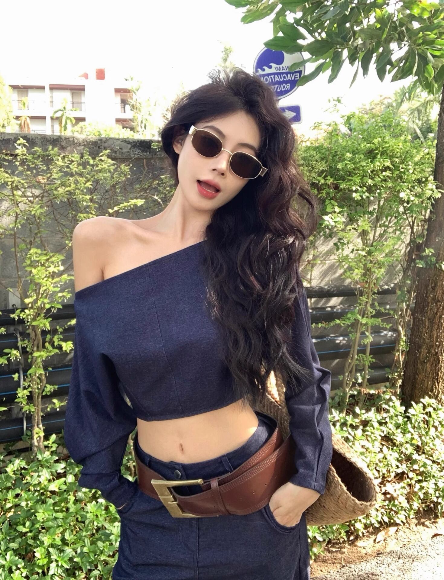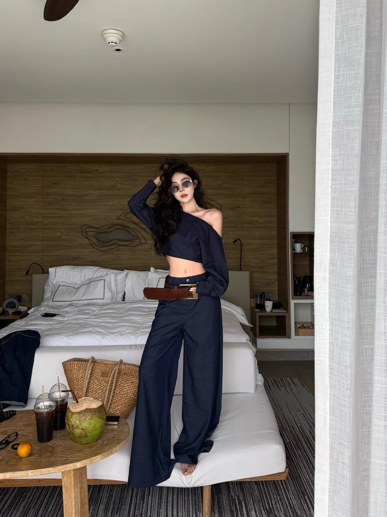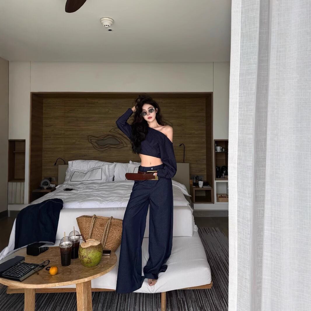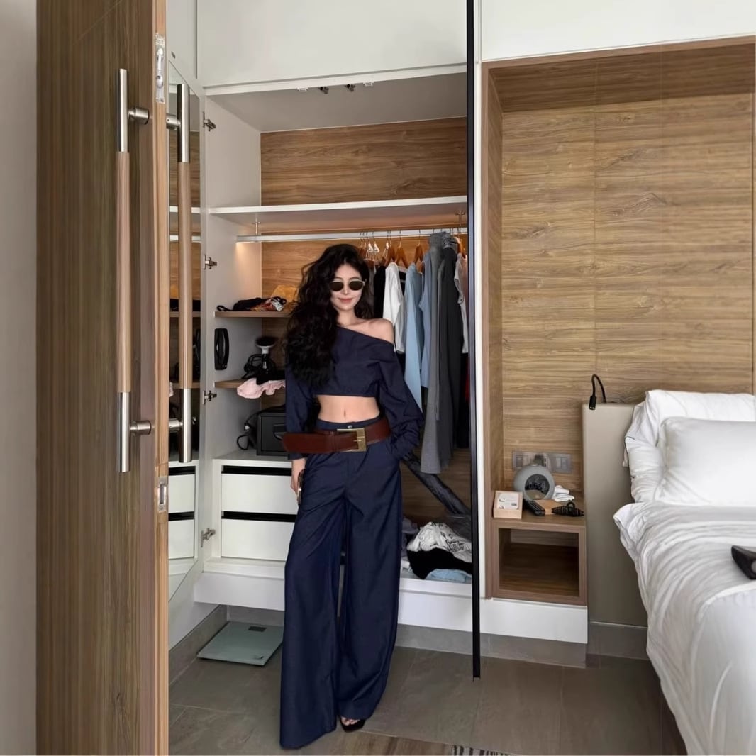 オフショルダー風 長袖トップス×ハイウエストワイドパンツ セットアップ レディース 春|美シルエット デニム調 二点セット きれいめ ギャル 通勤コーデ