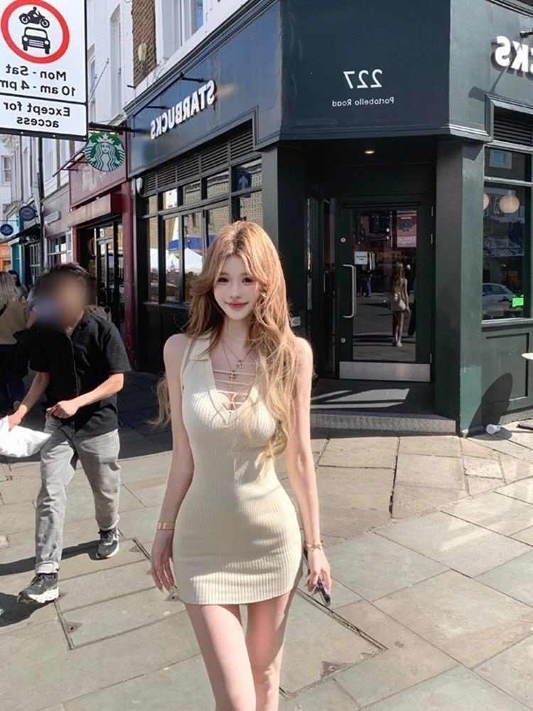 【グレー】バックオープン ニットホルターネックワンピース ノースリーブ ハイウエスト ウエストマーク ボディライン映え タイトミニワンピ(春夏)