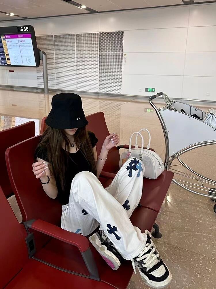 ホワイトクロスデザイン ストレートデニムパンツ ハイウエスト 直筒シルエット ユニセックス対応 ストリート映え オールドスクール系デニム(春)