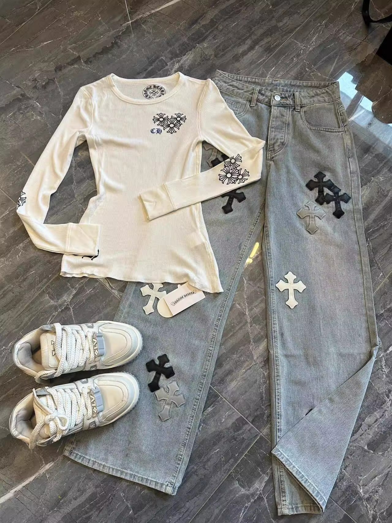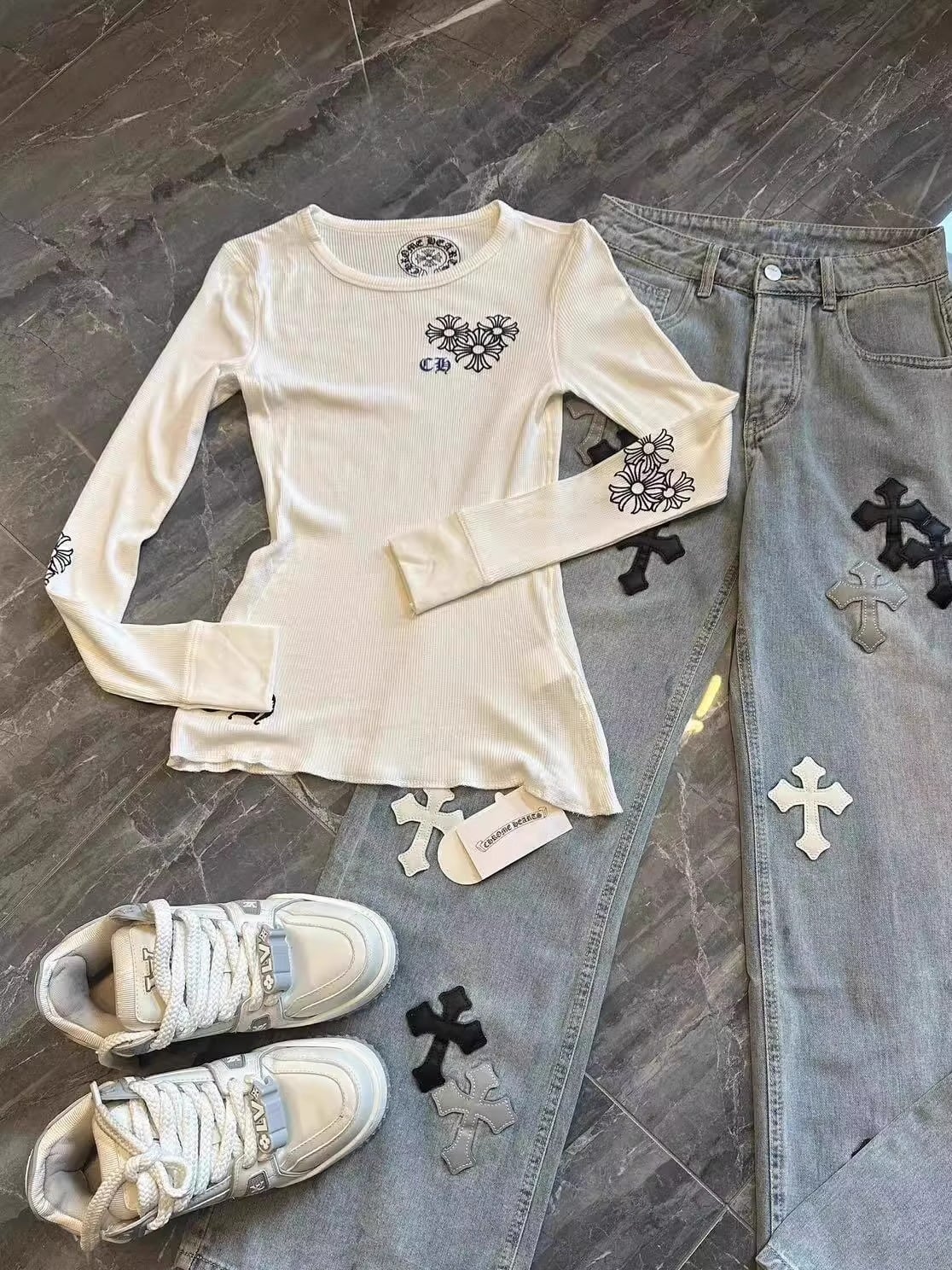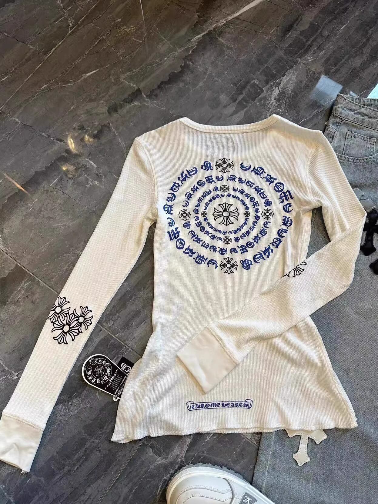 フロントに施されたクロスモチーフとテキストプリントが印象的な、