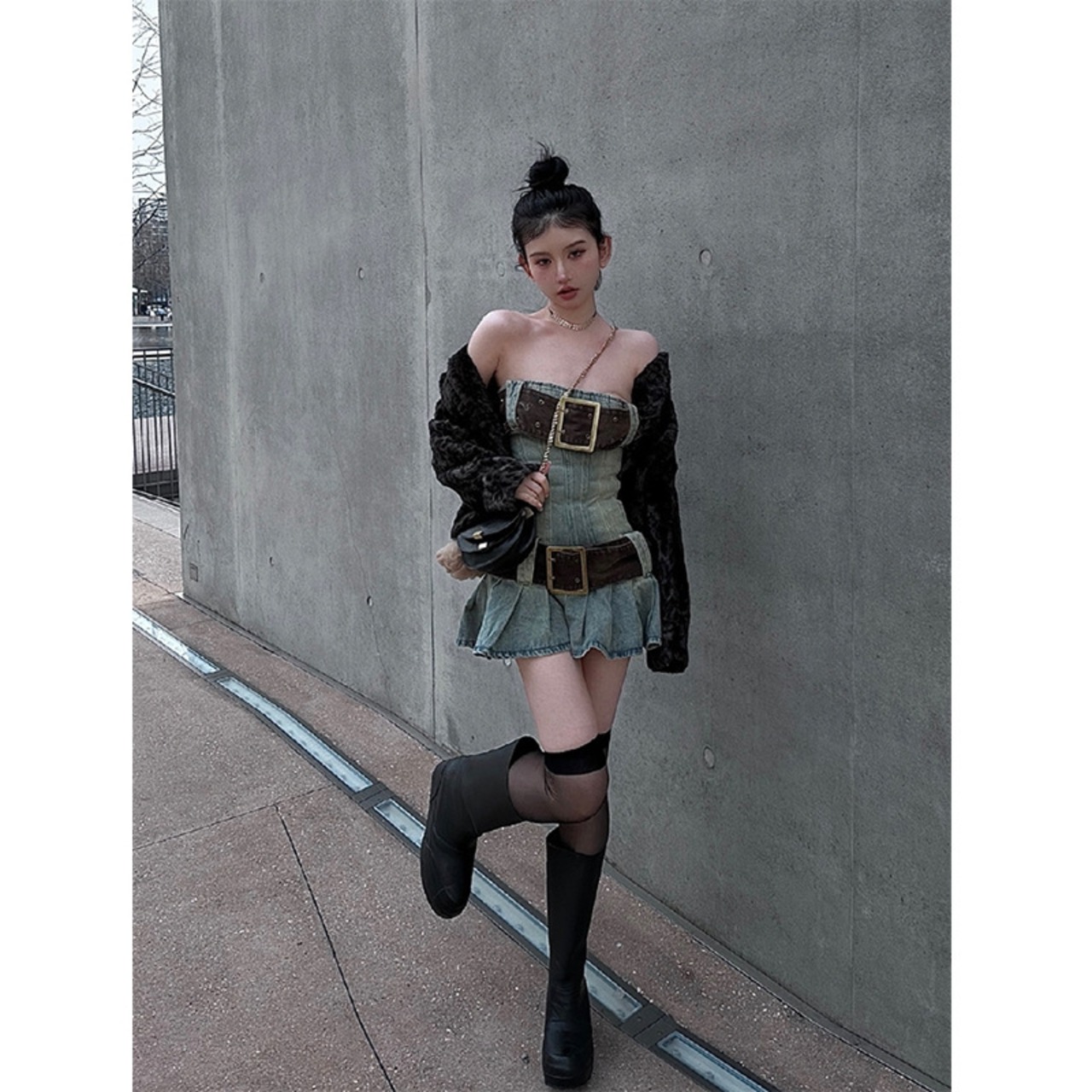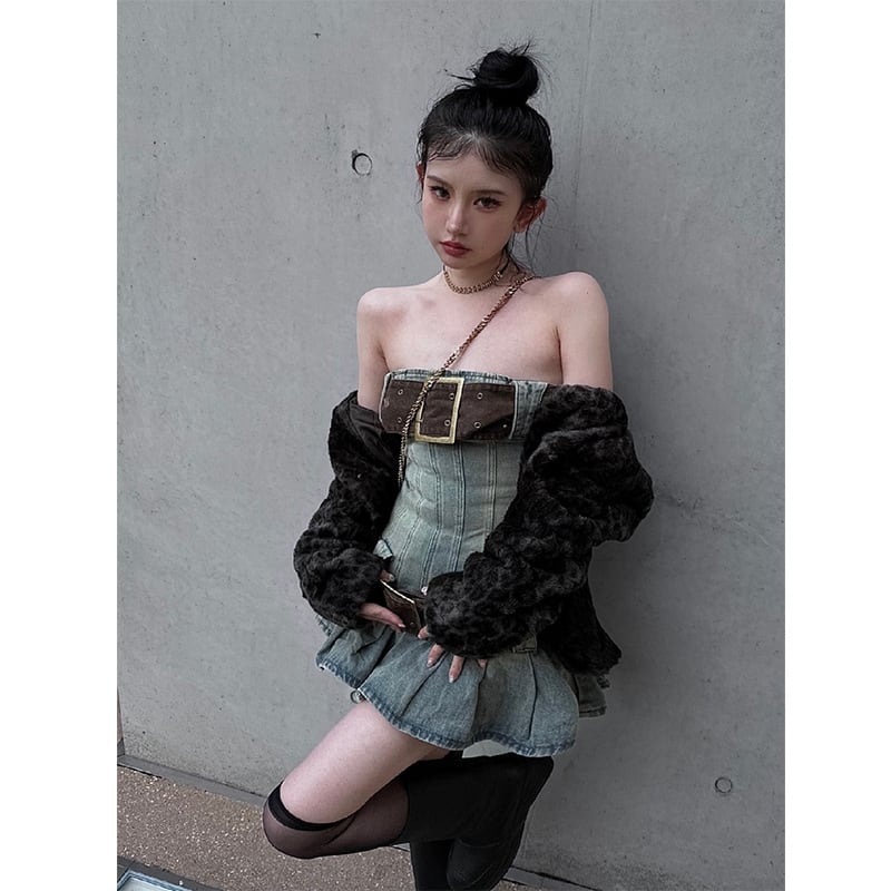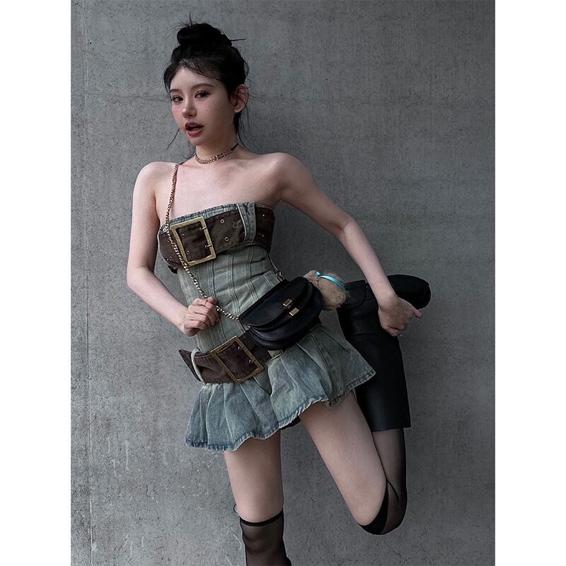 デニム ベアトップ風 ミニワンピース オフショルダー対応 プリーツAライン ストリート×レトロ 春夏レディースワンピース