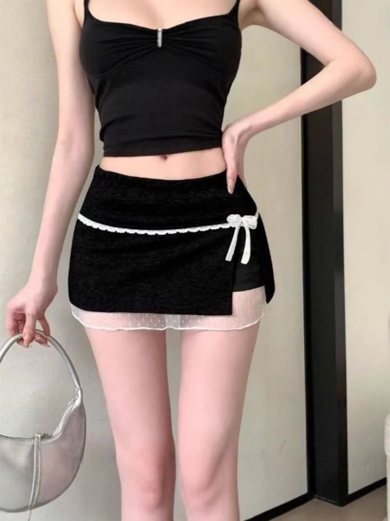 レース切替デザインのミニスカート。