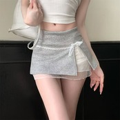【ホワイト】リボン付き レース切替 ミニスカート ハイウエスト タイトシルエット 美脚見え 甘さプラス 大人可愛い レディース(春夏)