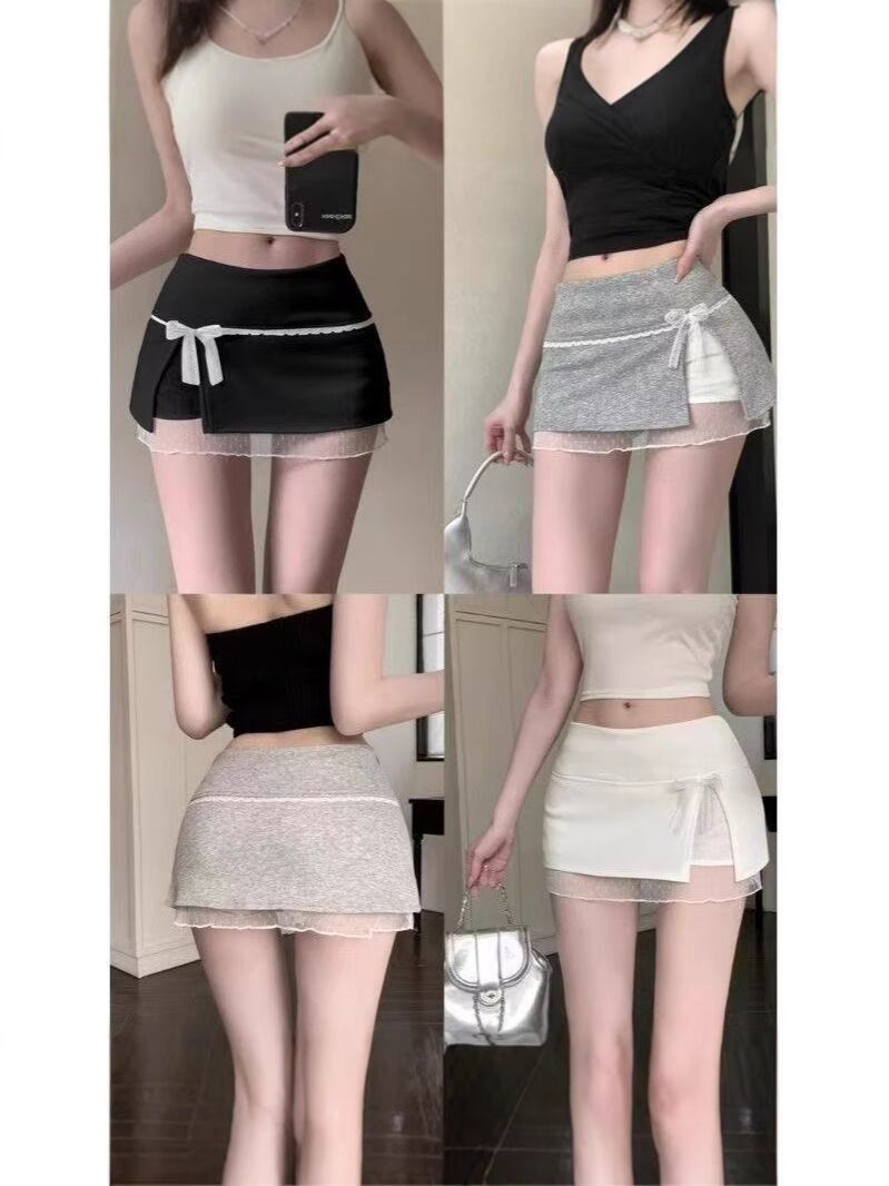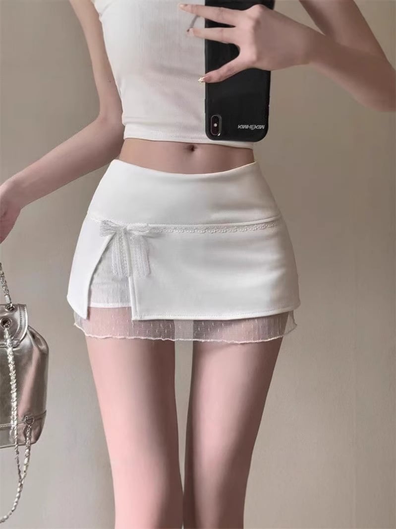 【ブラック】リボン付き レース切替 ミニスカート ハイウエスト タイトシルエット 美脚見え 甘さプラス 大人可愛い レディース(春夏)