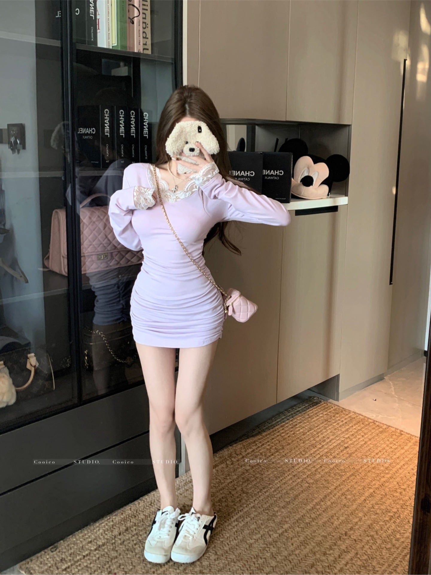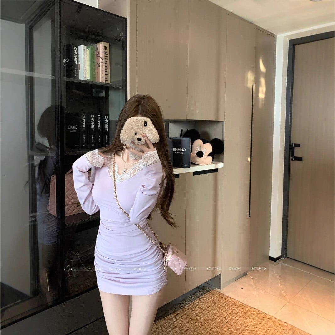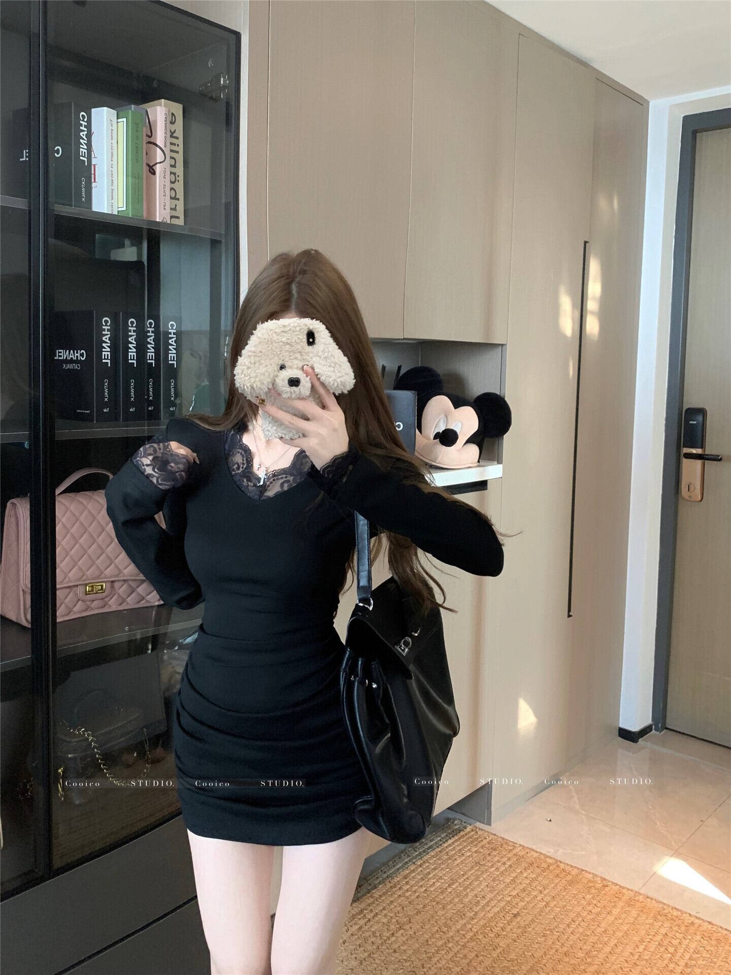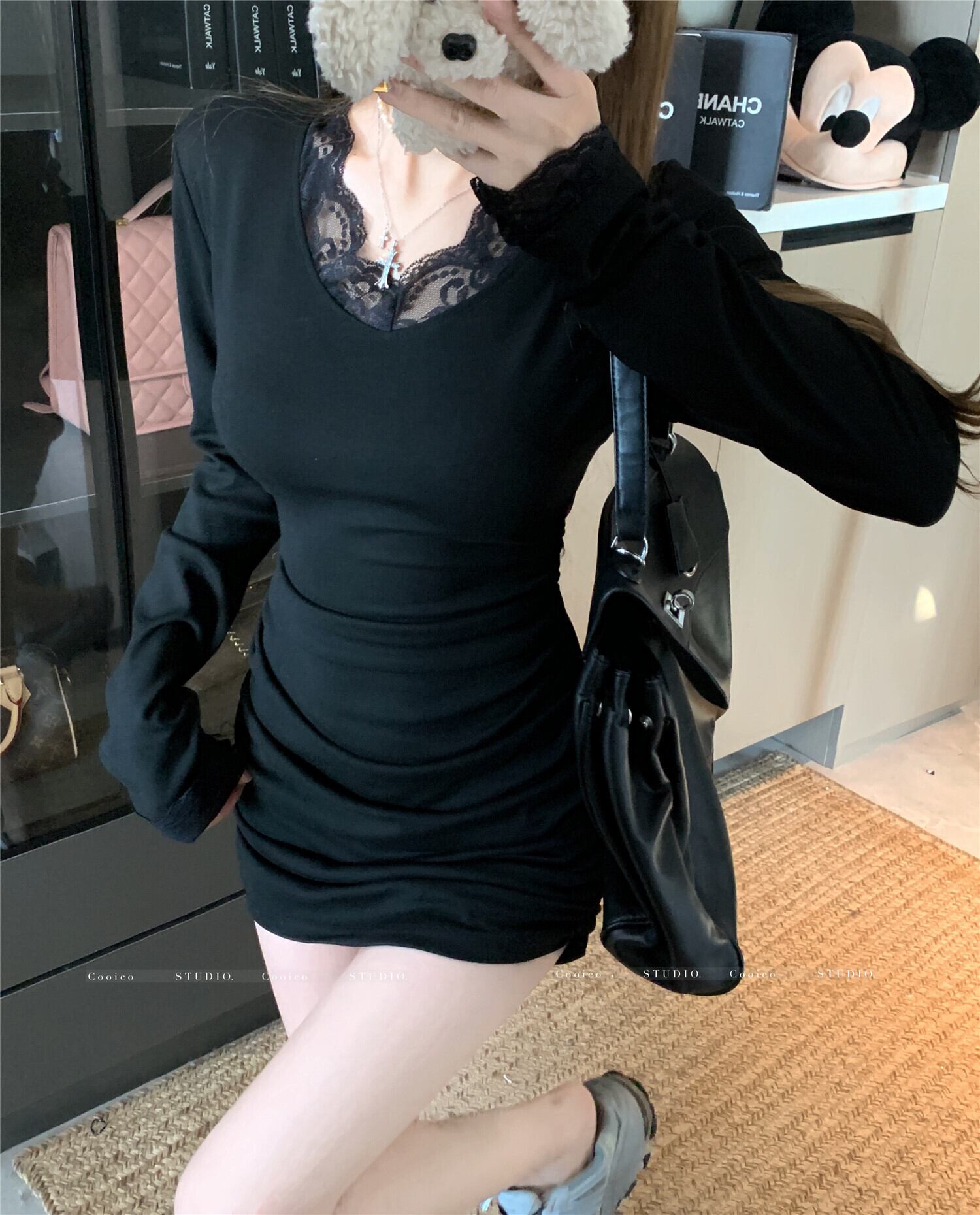 【ブラック】レースVネック タイトミニワンピース 高ウエスト 美シルエット 包み込むフィット感 大人フェミニン レディース(春)