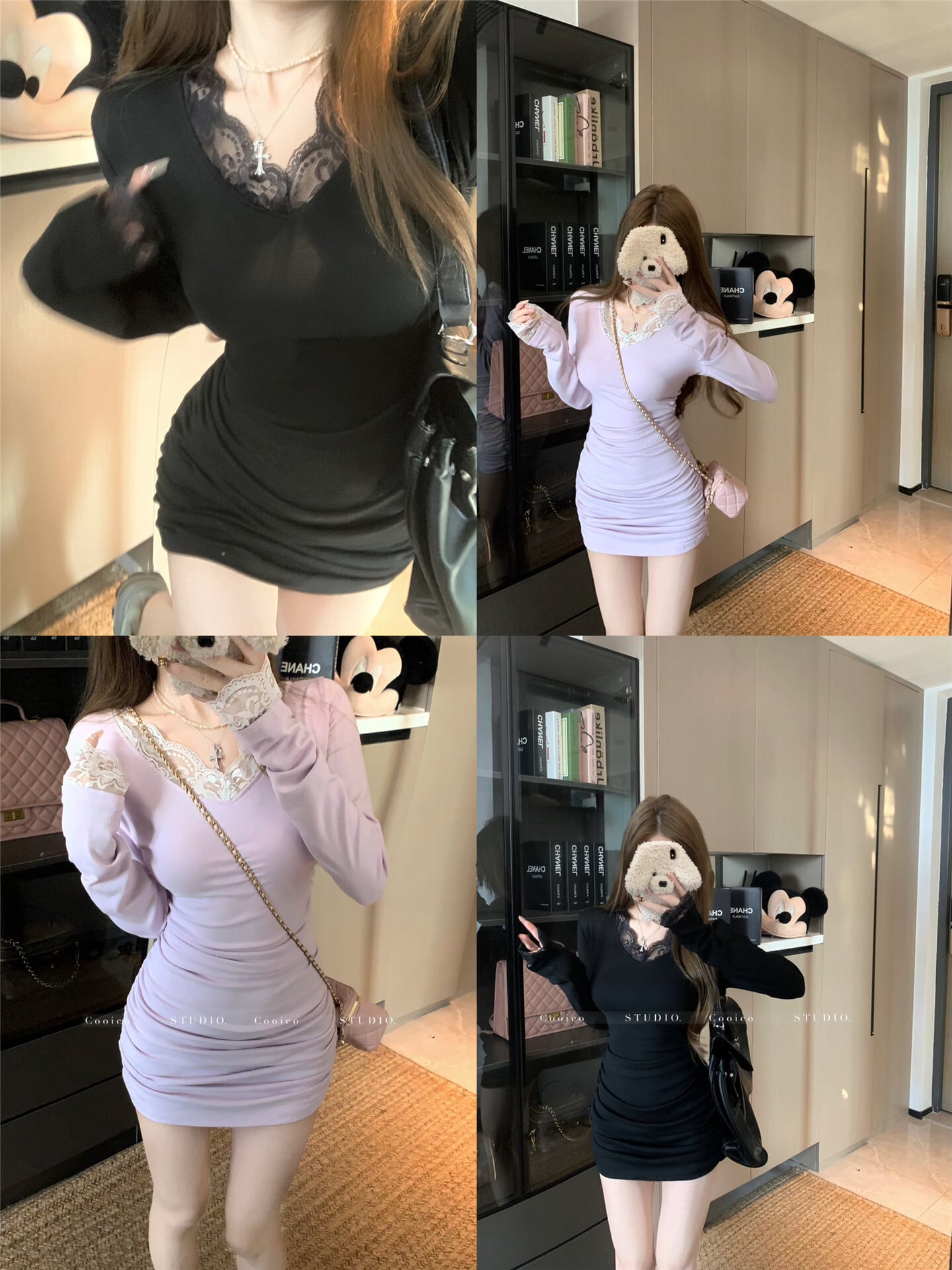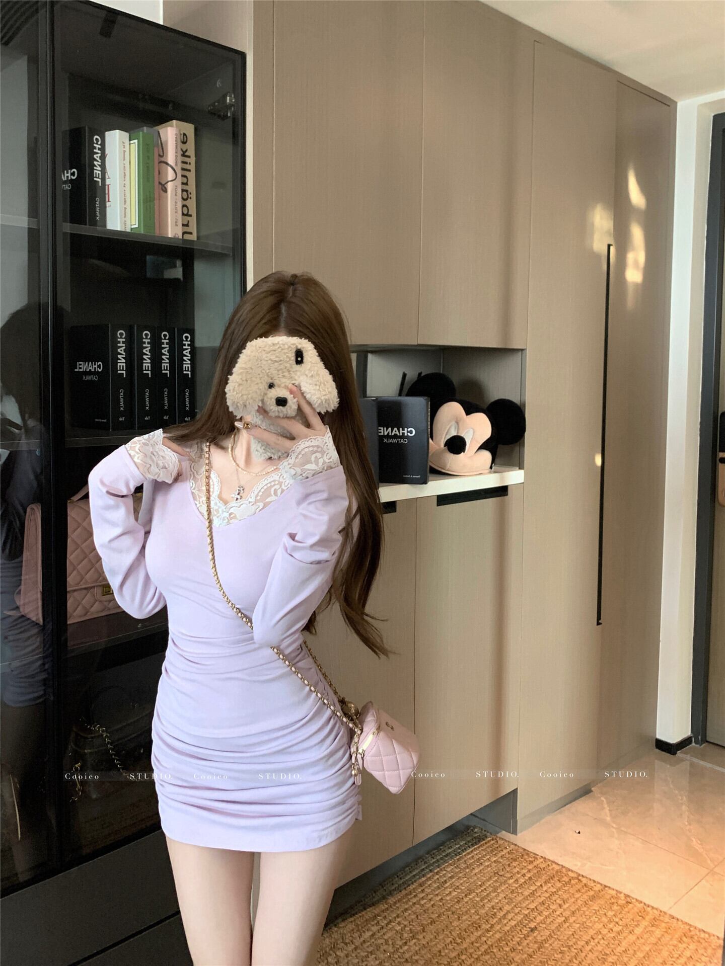 【パープル】レースVネック タイトミニワンピース 高ウエスト 美シルエット 包み込むフィット感 大人フェミニン レディース(春)