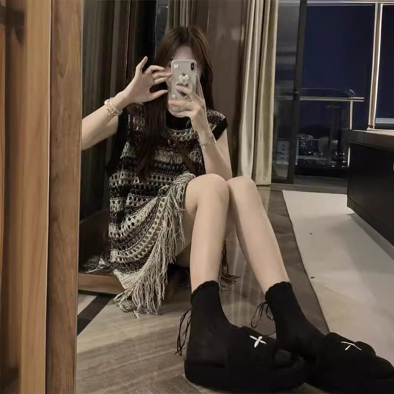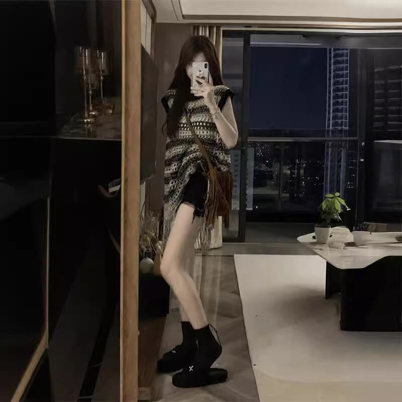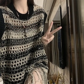 配色ストライプ 透かし編みニットトップス ノースリーブ 流しフリンジ デザインカットソー(夏)