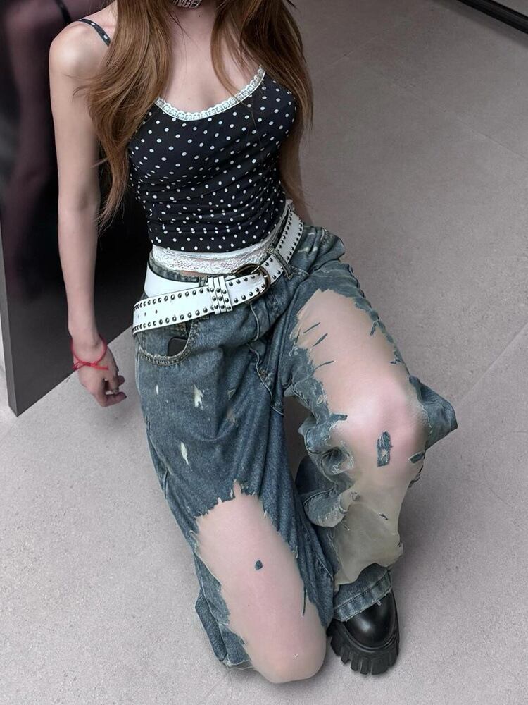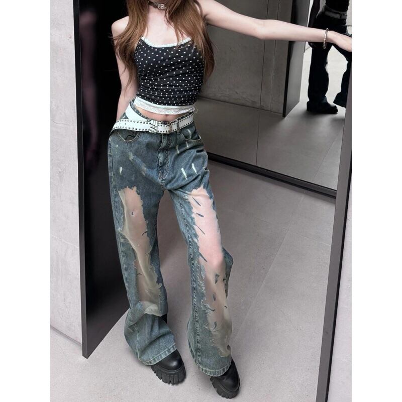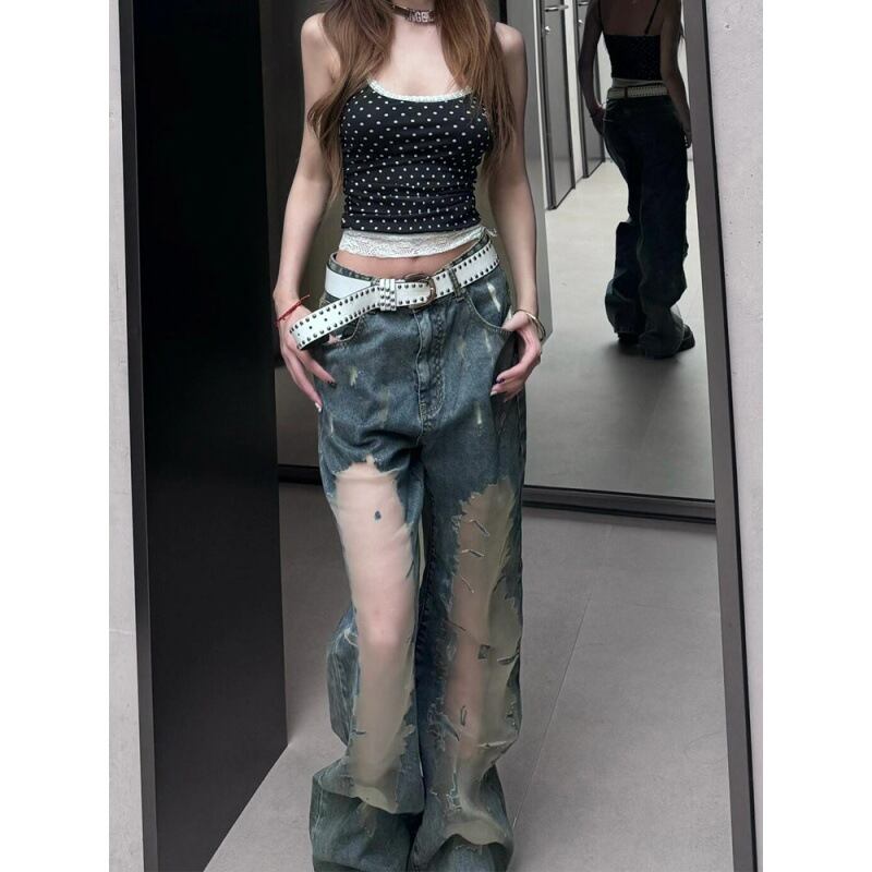 ヴィンテージウォッシュ ダメージデニムパンツ ハイウエスト ワイドシルエット ロング丈 デザインデニム(春夏)