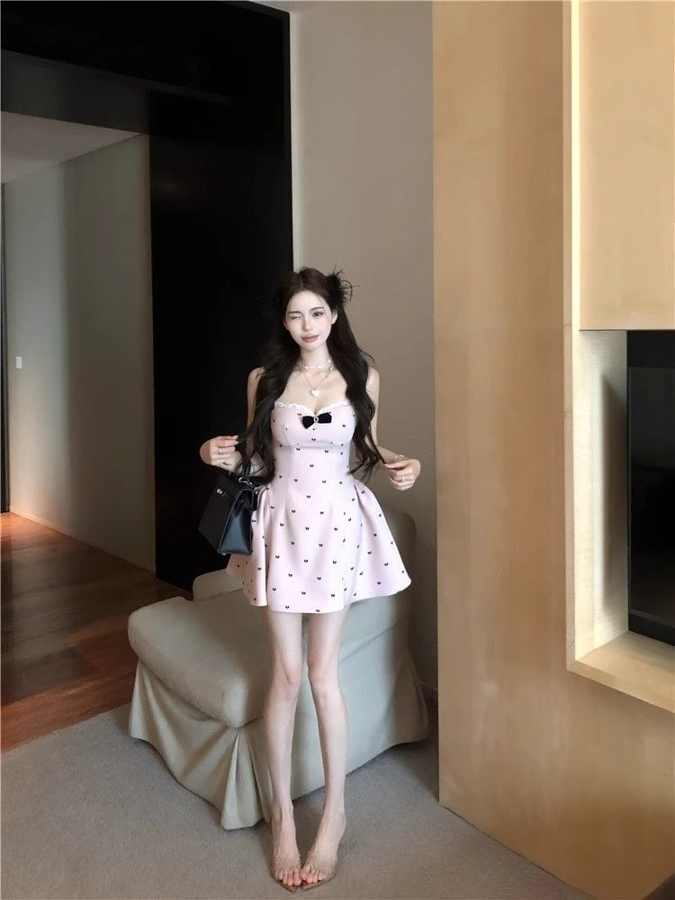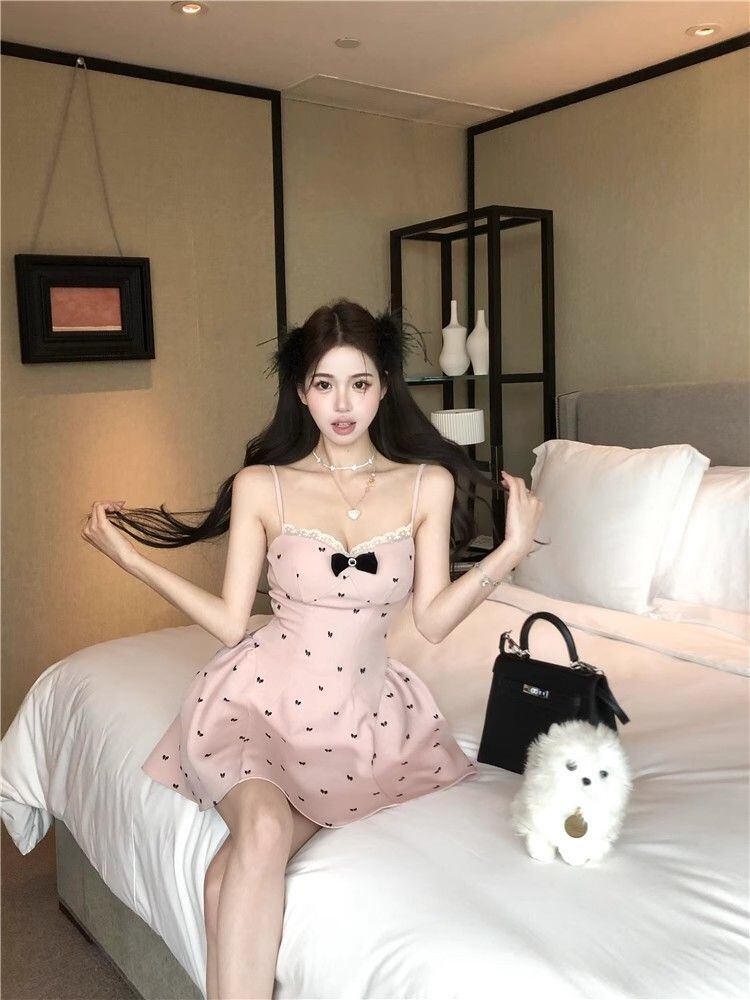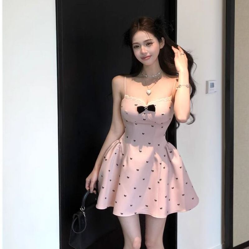 夏向け ウエストマーク キャミソールワンピース カップ付き Aライン フレアミニ丈 リボンプリント ピンク