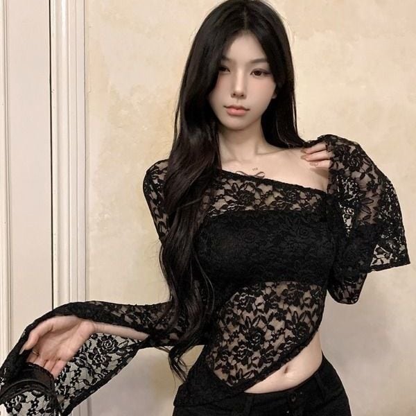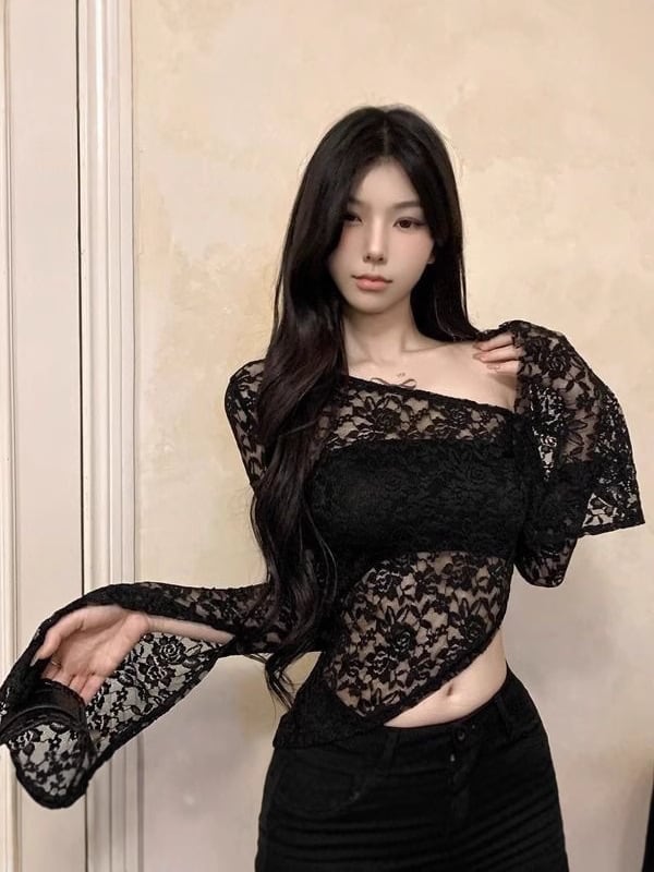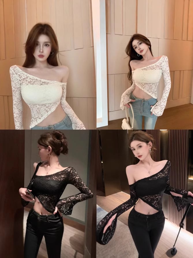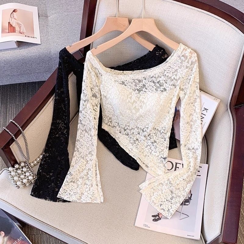 【ホワイト】アシンメトリー レースオフショル長袖トップス|フレアスリーブ・ショート丈