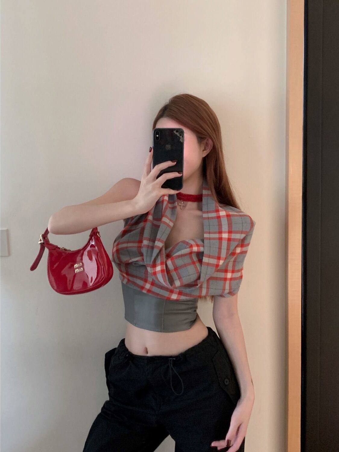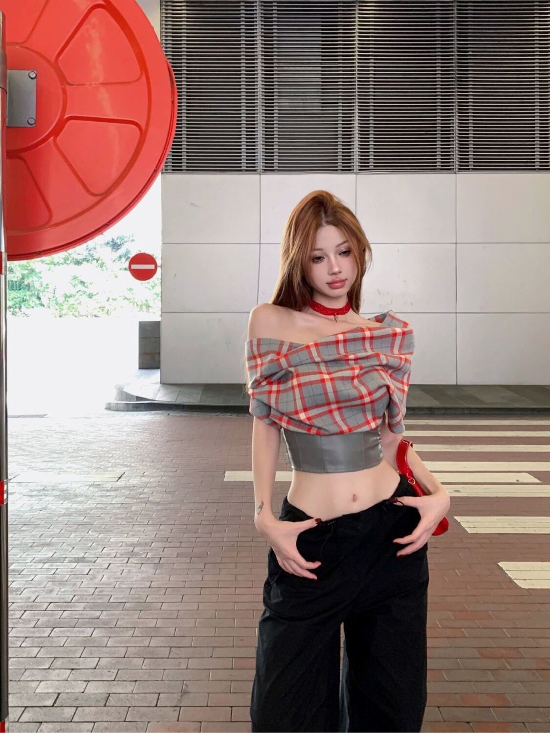 レトロチェック オフショル風バックオープントップス|ショート丈・半袖