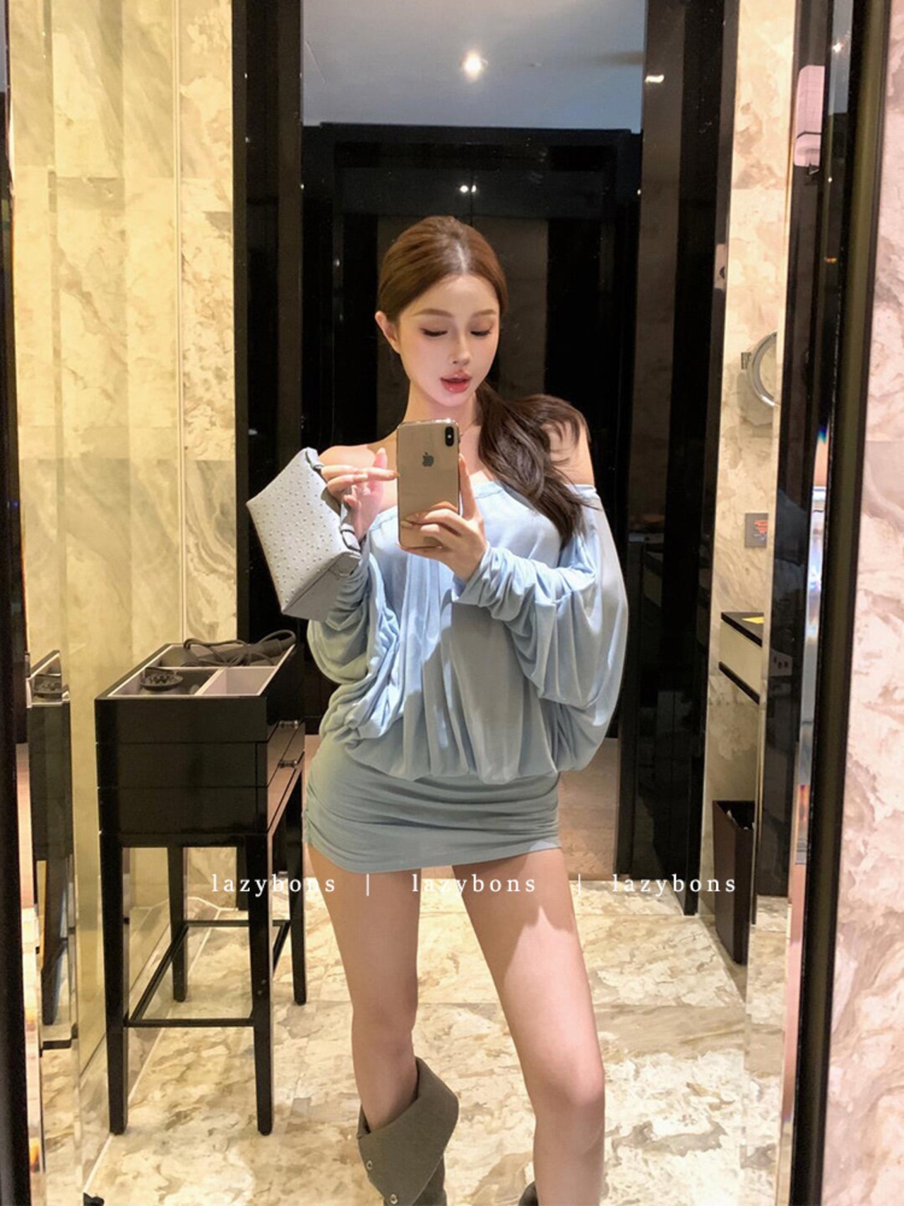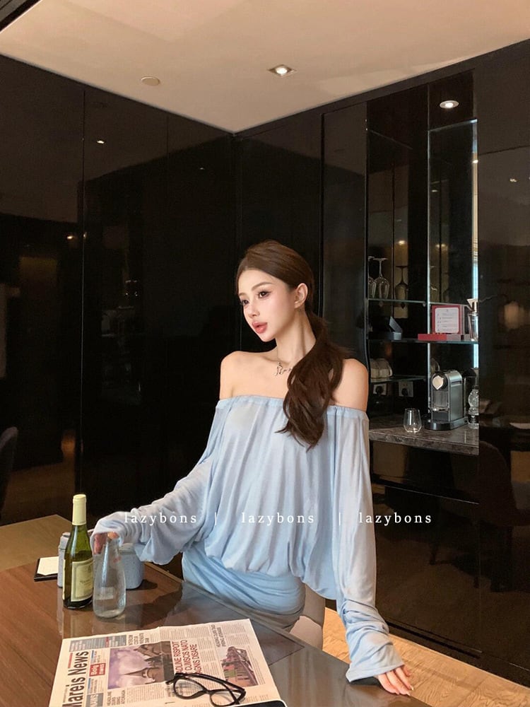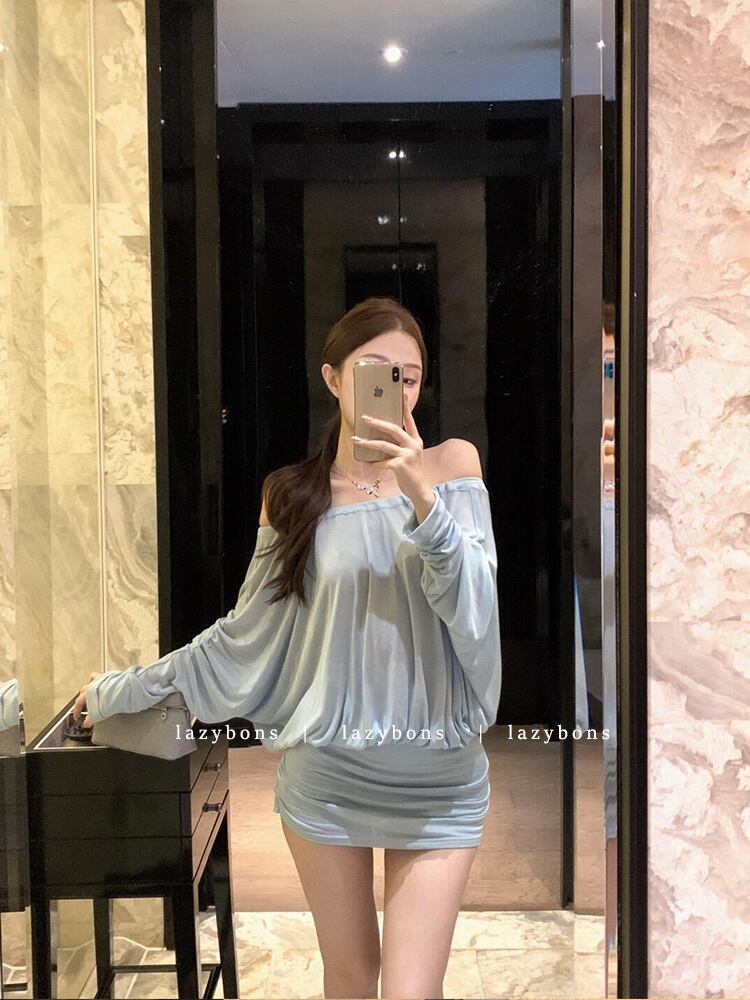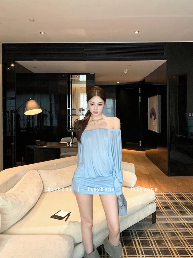 オフショルダー風 ウエストマークワンピース|ブルー|春ワンピ