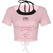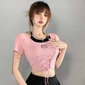【ブラック】2025夏 新作♡ くびれ見せリボン付きクロップドTシャツ 甘辛ガーリー/スタイルアップ/コンパクトトップス
