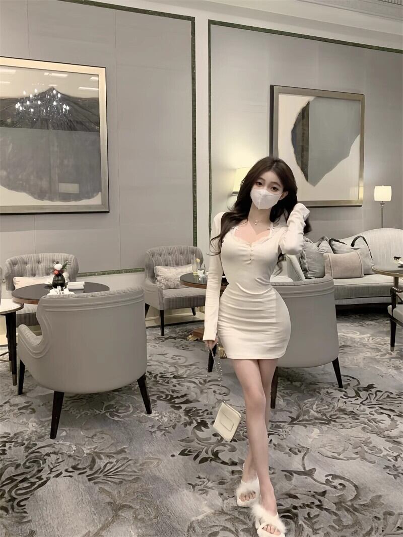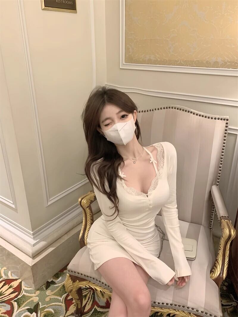 【アイボリー】レース切替 ホルターネック風 長袖ミニワンピース レディース 春