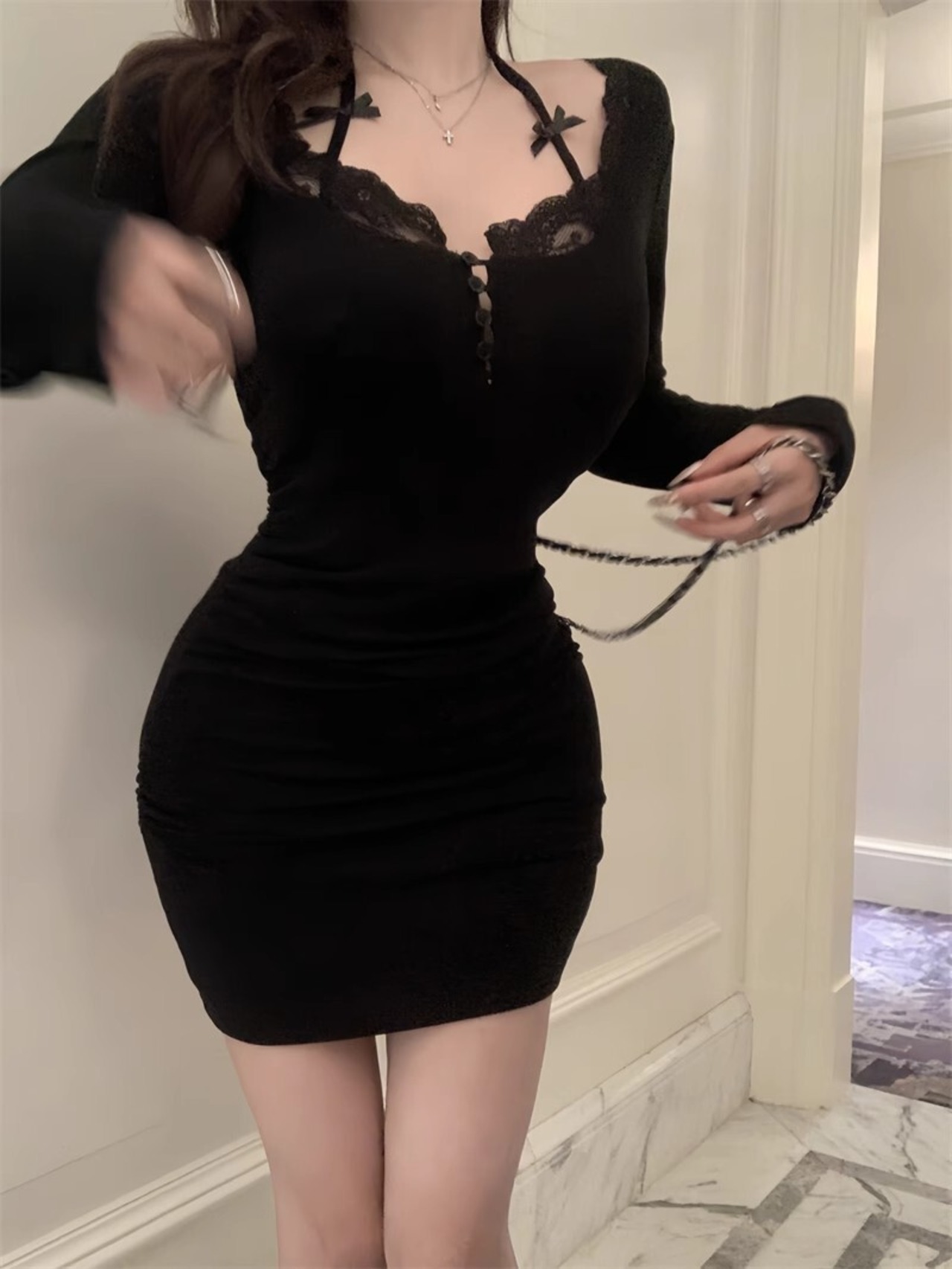 繊細なレース素材を取り入れた、女性らしい印象の長袖ミニワンピース。