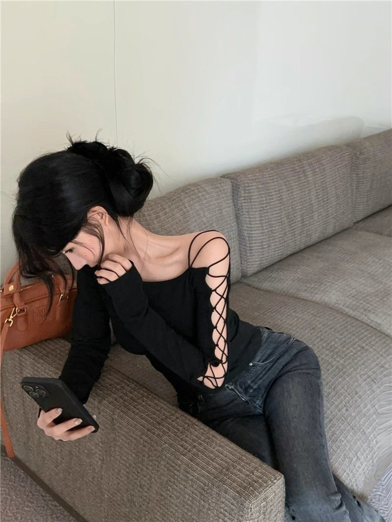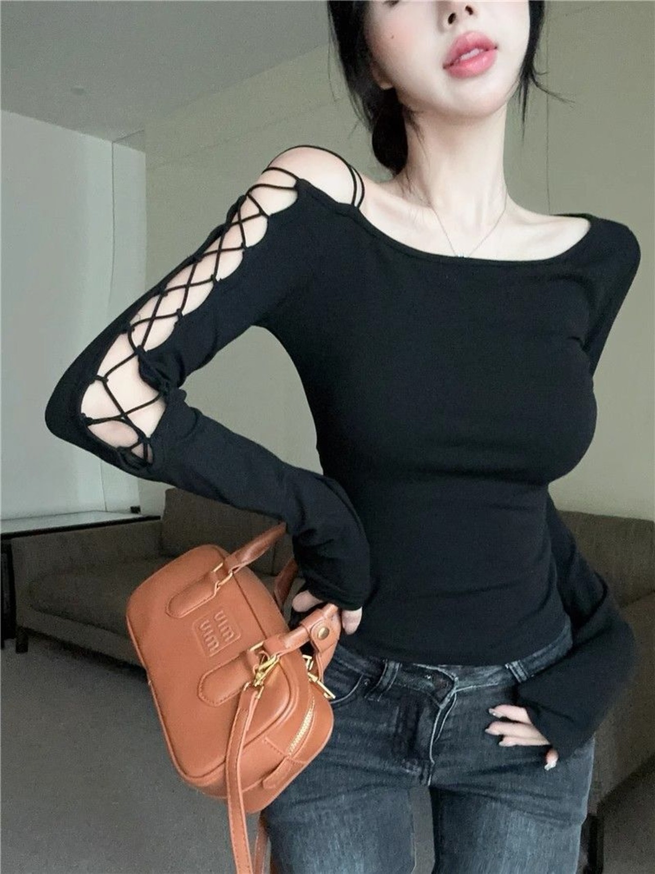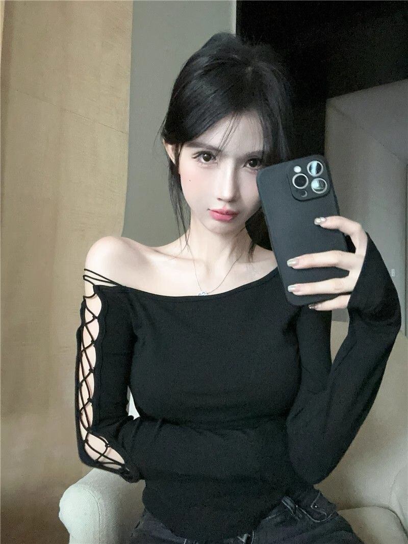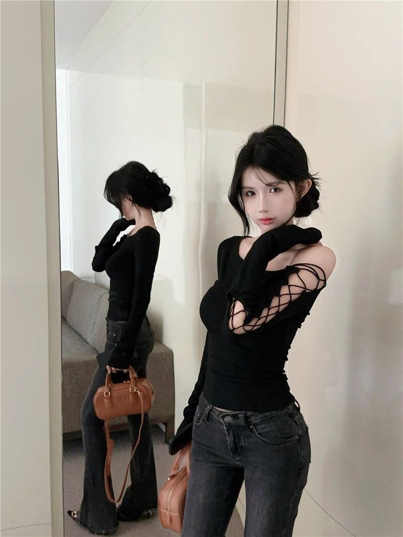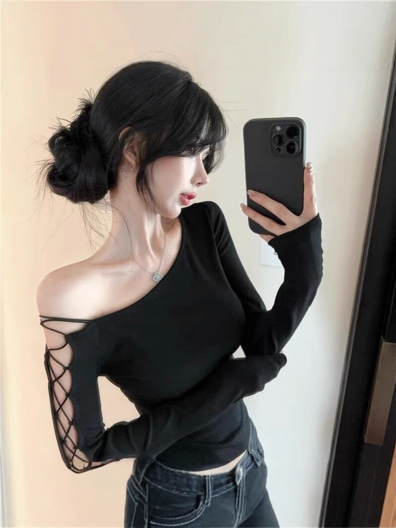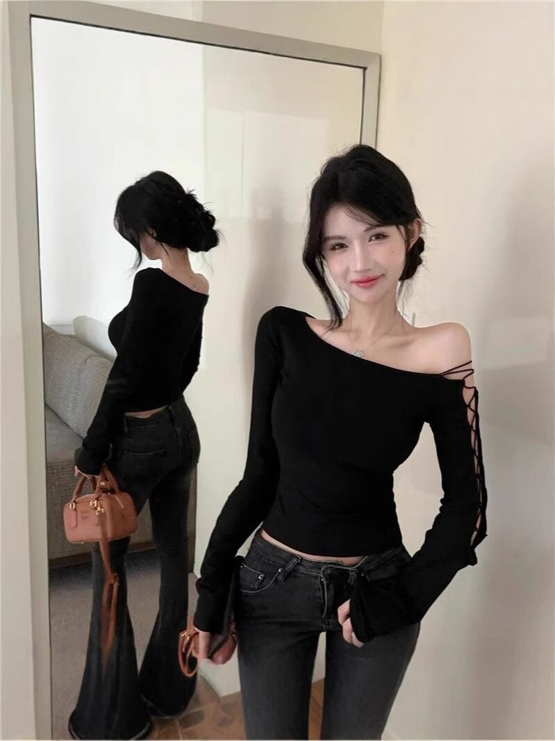 アシンメトリーネック リボンデザイン 長袖ショートトップス レディース 春