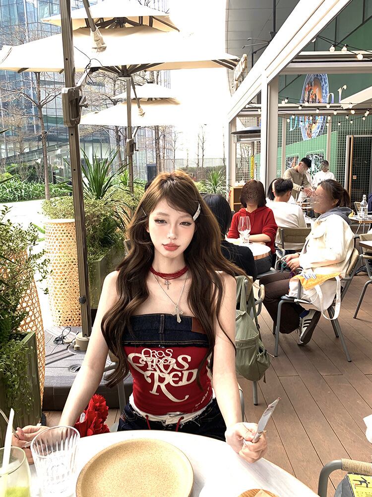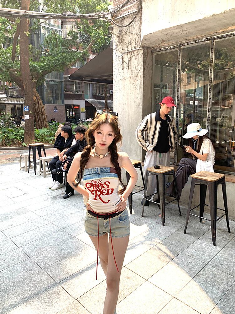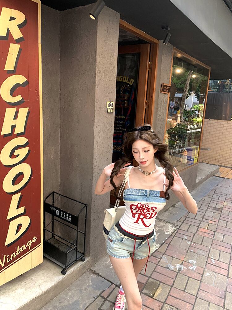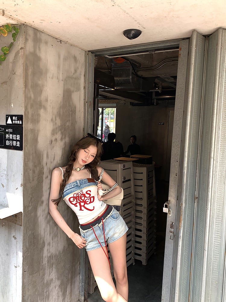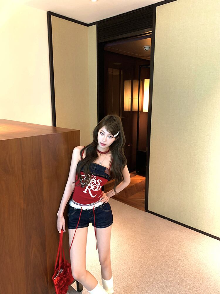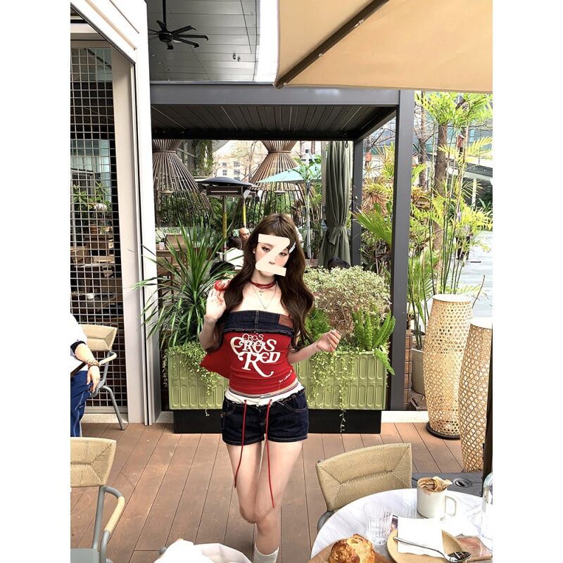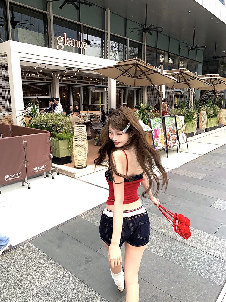 ・レッド(デニム切替キャミソール)×ネイビーデニムショートパンツ