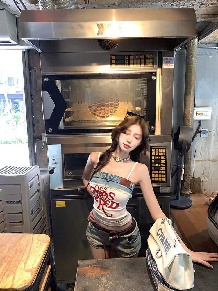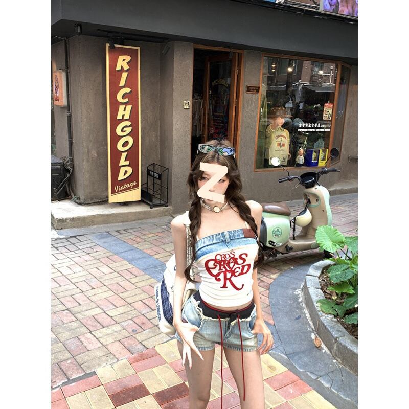 ロゴプリントとデニム素材を組み合わせた、存在感のあるキャミソールトップス。